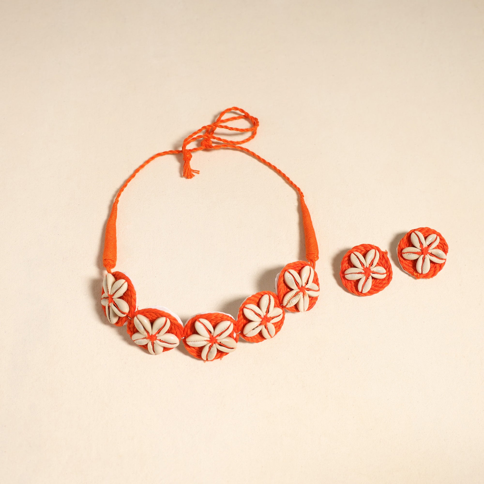 Add a touch of handmade charm to your ensemble with this elegant orange thread and shell work necklace set. It comes with matching earrings to effortlessly enhance your traditional or Indo-fusion look. Handcrafted by skilled artisans, it's ideal for festive gatherings, cultural events, or to bring a unique flair to your everyday style. It also makes a meaningful gift for your loved ones.