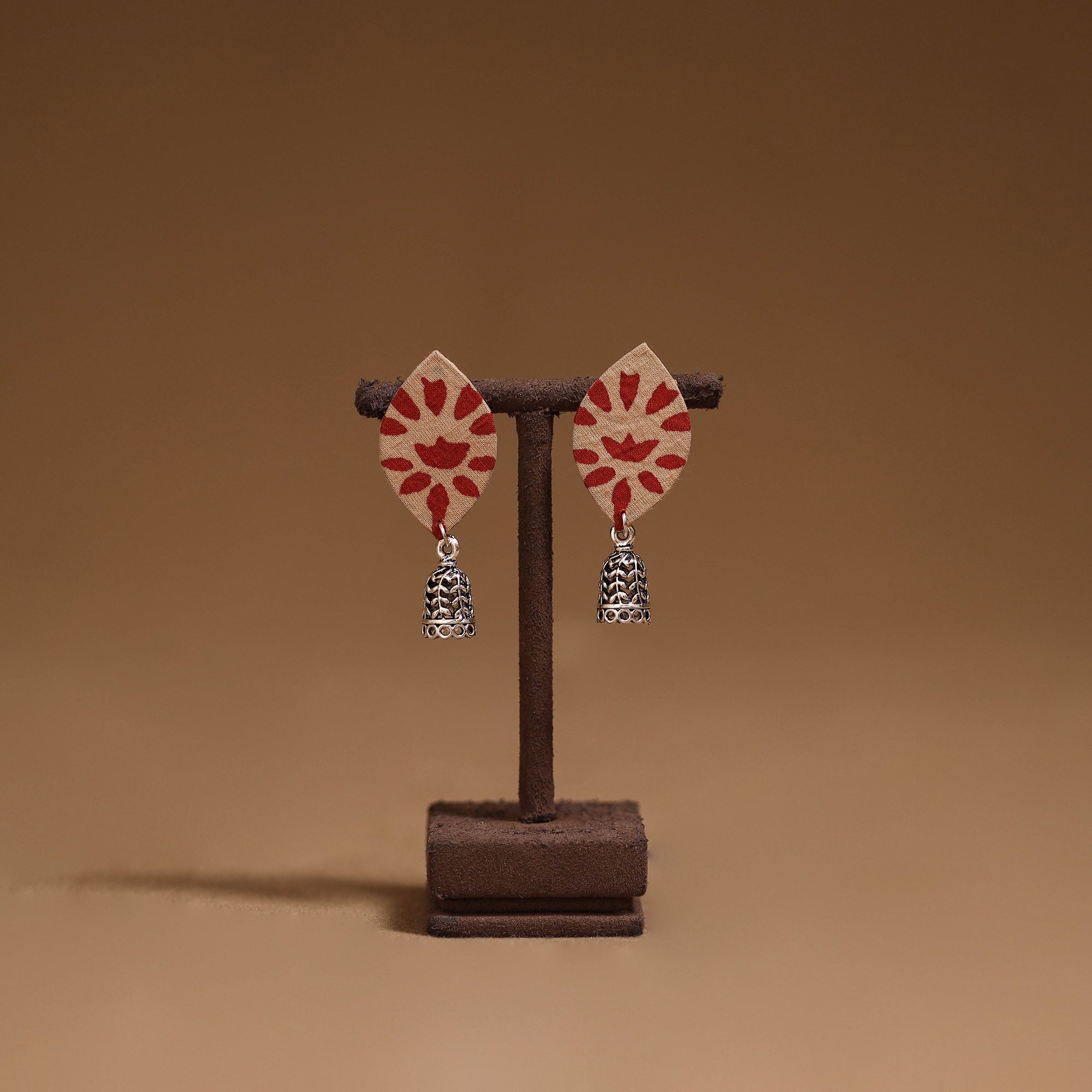 Handmade fabric earrings with german silver jhumki is attached at the end, that enhances its charm. Perfect for everyday wear or special occasions, these earrings blend traditional style with a graceful touch.