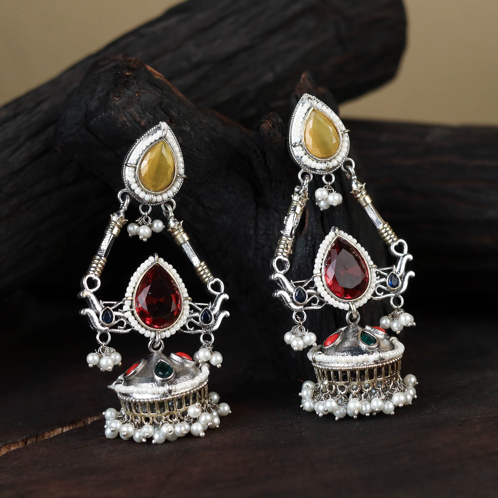 These white german silver-plated handcrafted jhumka earrings feature a timeless blend of oxidised metal, pearls, stones, and intricate detailing. Elegant in silver tones, they seamlessly pair with ethnic ensembles and casual Western attire, making them a versatile choice for festivals, weddings, or any special occasion. A thoughtful gift that adds a graceful nod to tradition in every moment.