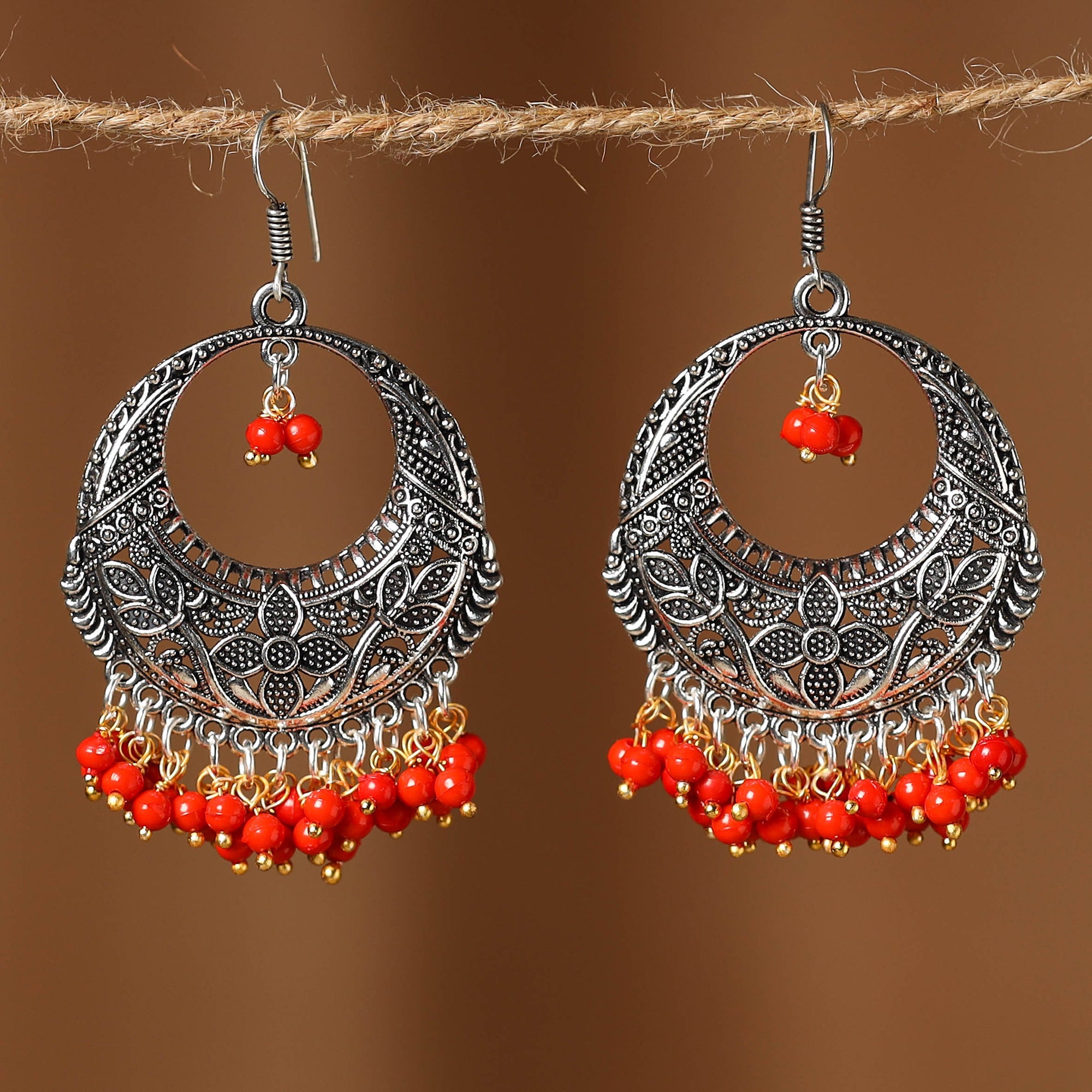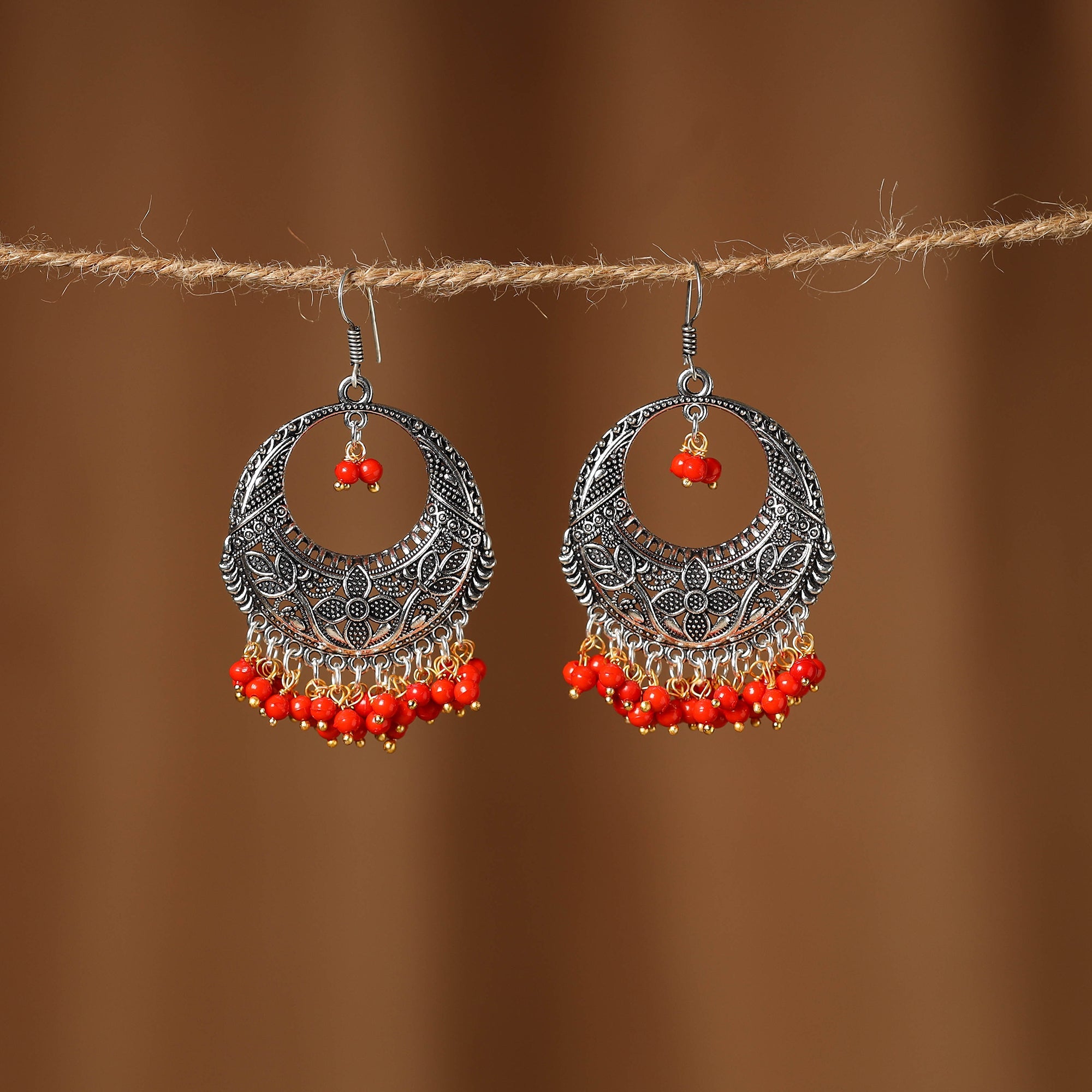 These red handcrafted earrings are made from oxidised german silver and embellished with intricate beadwork. Known for its durability and antique-like finish, german silver gives these earrings a distinctive, elegant look. Ideal for festive occasions, casual outings, or elevating your daily ensemble with a subtle artisanal flair.