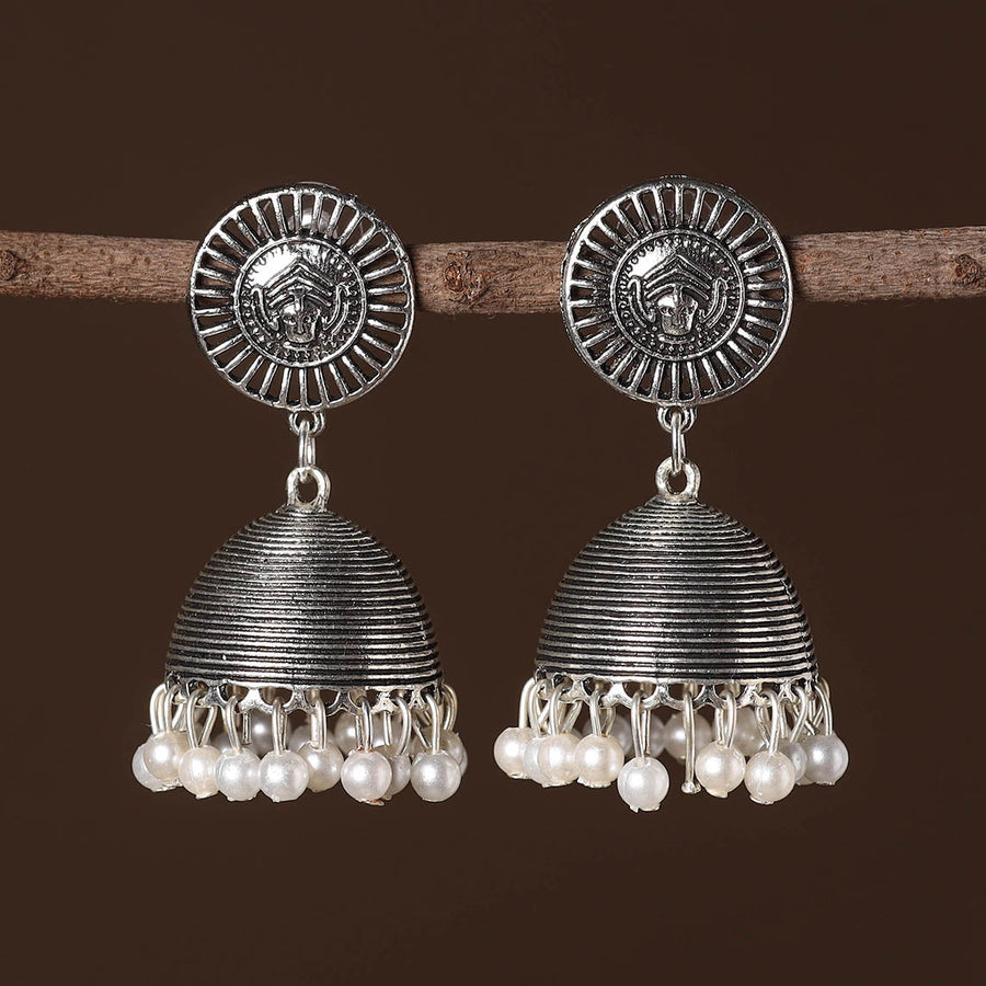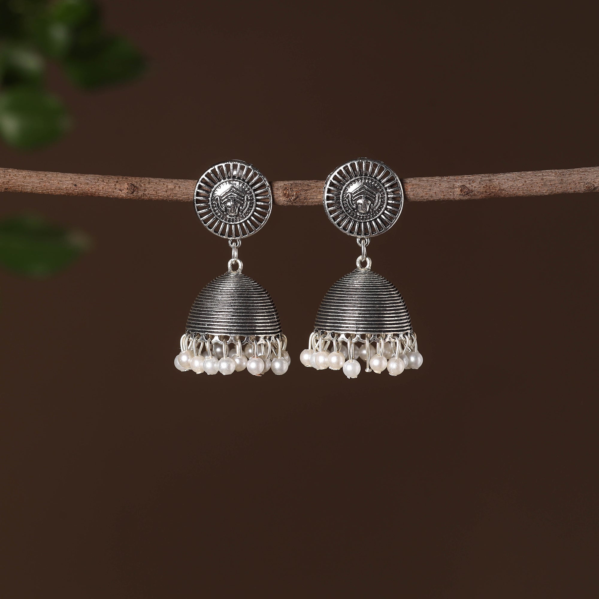 Add a touch of tradition and elegance to your look with our grey german silver beaded jhumki earrings for women. Crafted from oxidised german silver, these beautiful earrings feature intricate beadwork. Perfect for both casual outings and festive celebrations, they enhance any outfit with their unique charm.