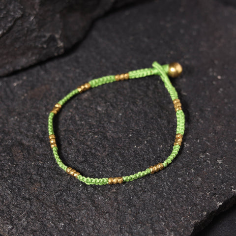 Handcrafted brass metal alloy dokra beads and green threadwork anklet, made by tribal artisans using the ancient lost-wax casting technique known as ‘cire perdue’. This traditional method involves replacing wax with molten metal, time-intensive process still practiced in tribal regions of Chhattisgarh and Odisha. Lightweight yet detailed, this anklet adds a rustic, ethnic charm to everyday wear, festive looks, or cultural outfits.