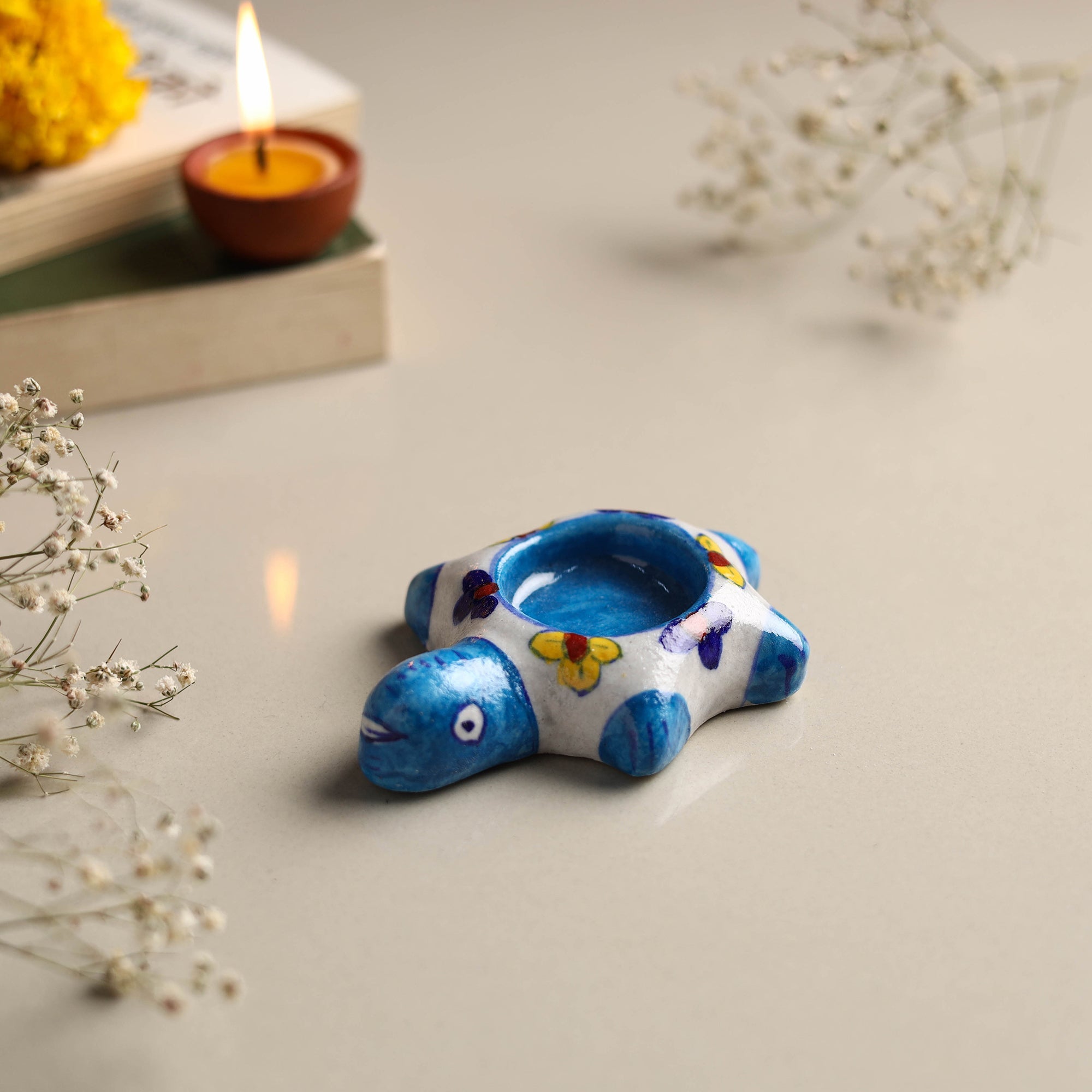 Elevate your space with this blue original blue pottery ceramic tealight candle holder handmade by skilled artisans from rajasthan. A reflection of India rich pottery heritage this candle holder brings culture to any setting, whether for a festive gathering or a cozy night in.