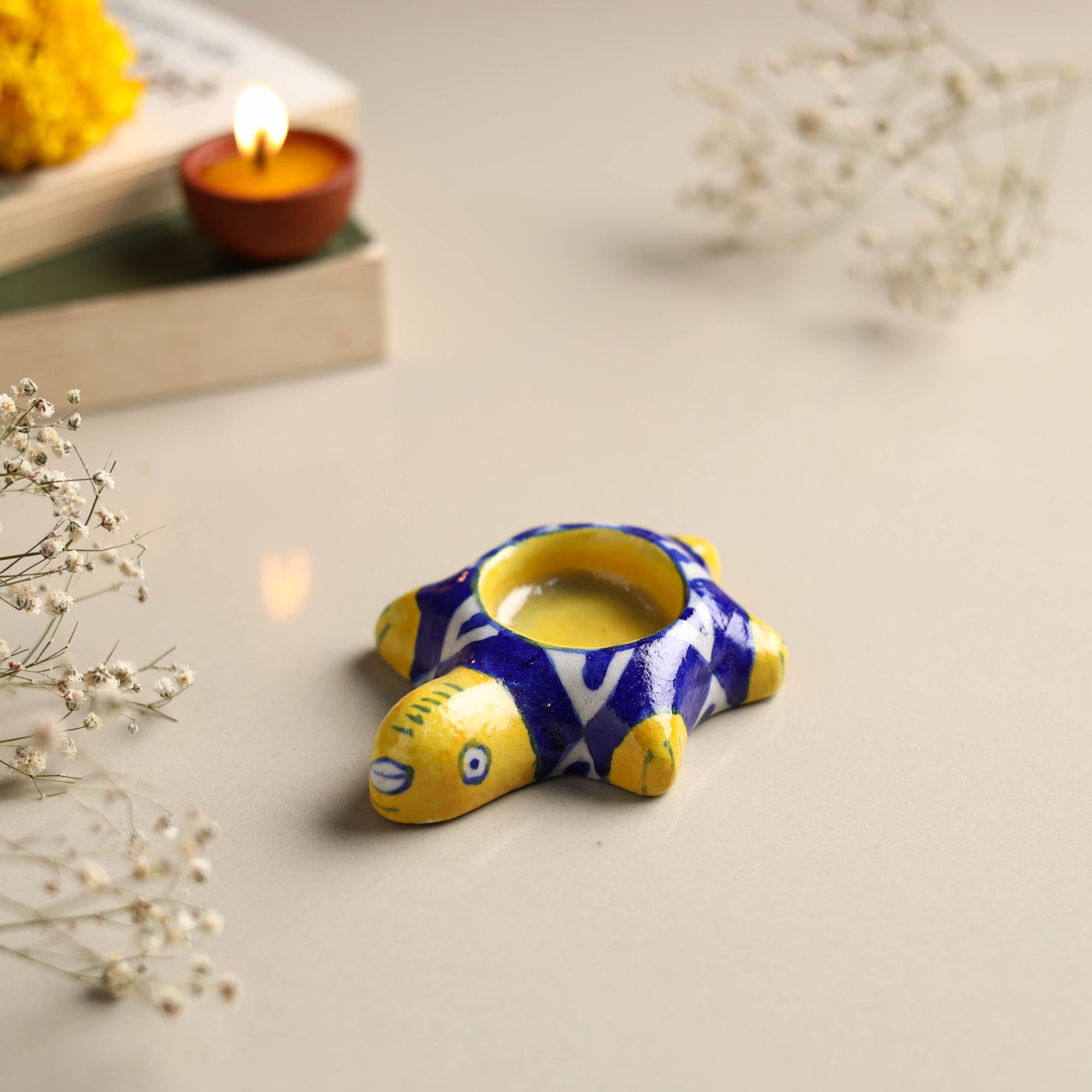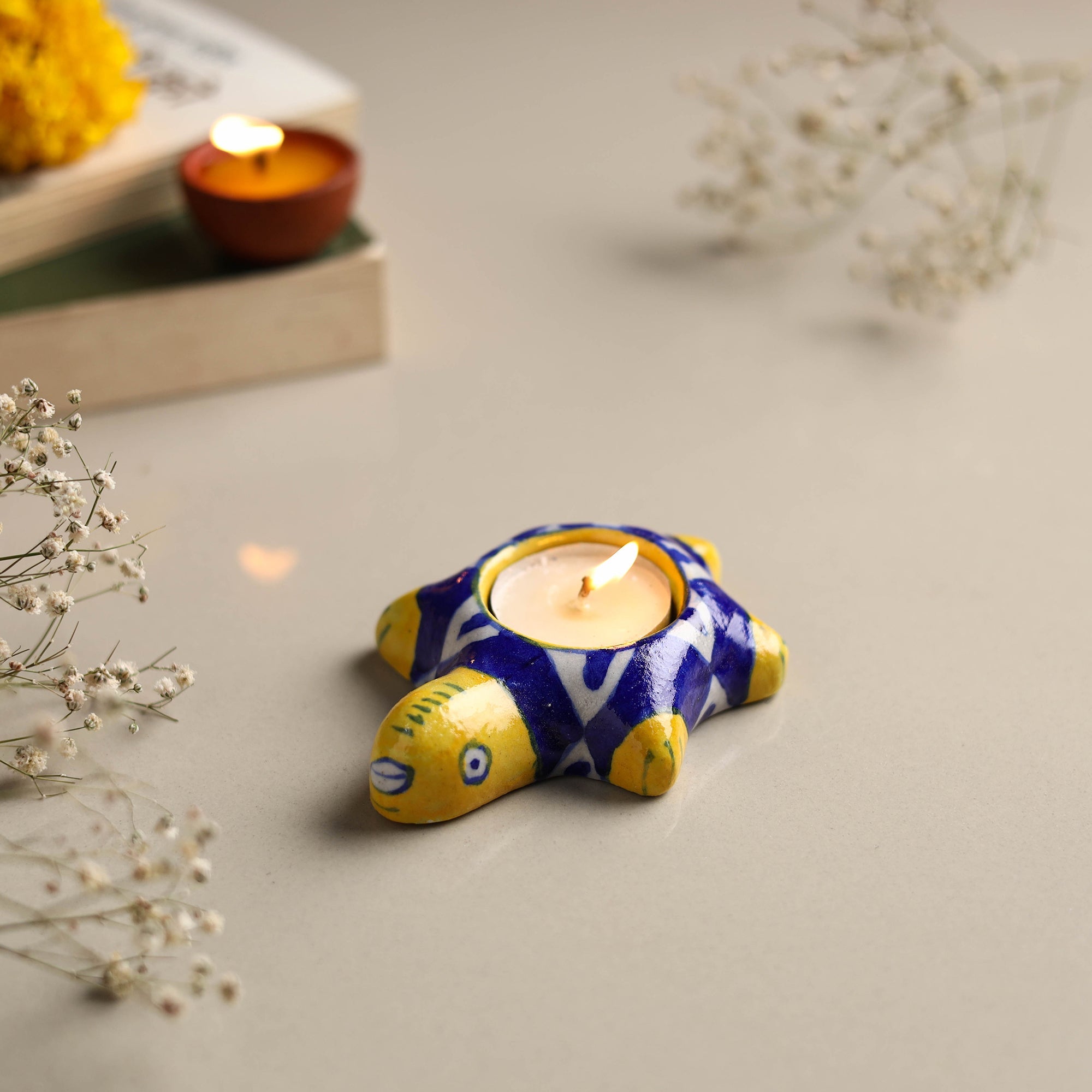 Elevate your space with this blue original blue pottery ceramic tealight candle holder handmade by skilled artisans from rajasthan. A reflection of India rich pottery heritage this candle holder brings culture to any setting, whether for a festive gathering or a cozy night in.