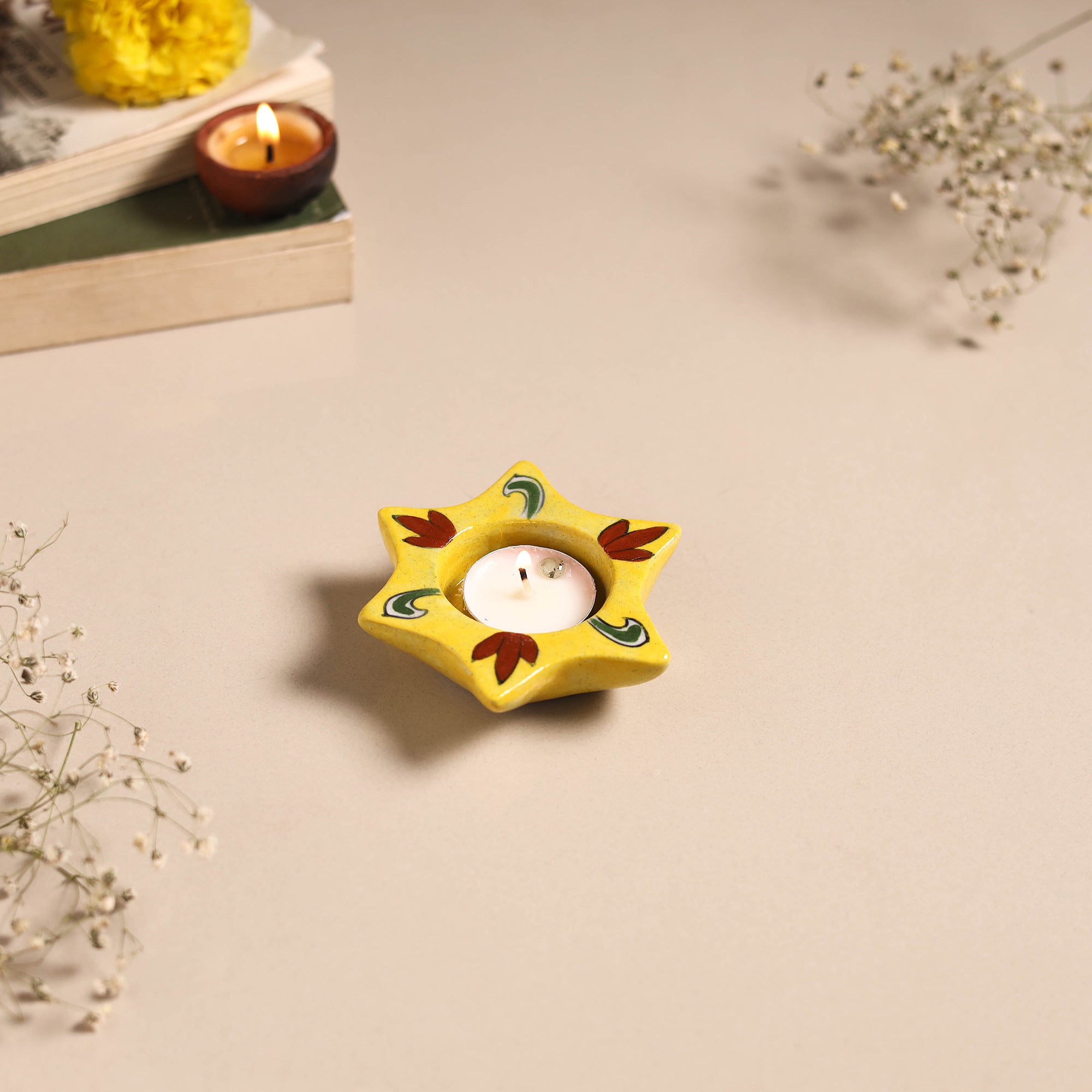 Celebrate tradition with this yellowartisan-made blue pottery tealight candle holder. Created using Jaipur’s iconic blue pottery technique, it features radiant hues and fine detailing. This centuries-old craft is uniquely made without clay, using quartz stone, multani mitti, glass, and other natural elements for its signature finish.
