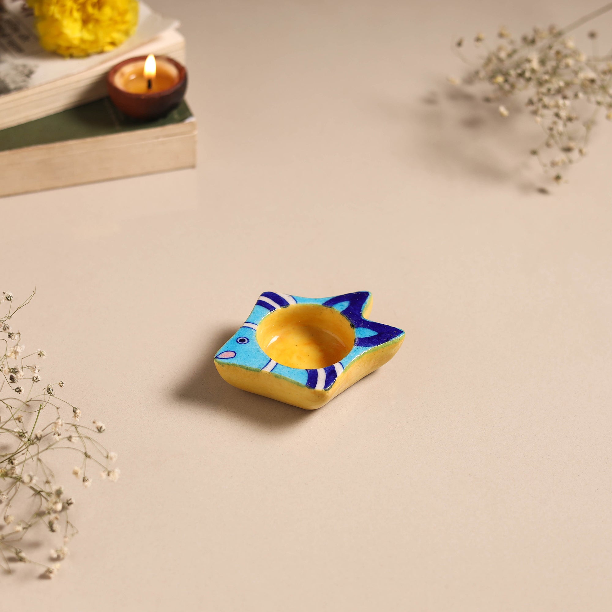 Celebrate tradition with this yellow artisan-made blue pottery tealight candle holder. Created using Jaipur’s iconic blue pottery technique, it features radiant hues and fine detailing. This centuries-old craft is uniquely made without clay, using quartz stone, multani mitti, glass, and other natural elements for its signature finish.