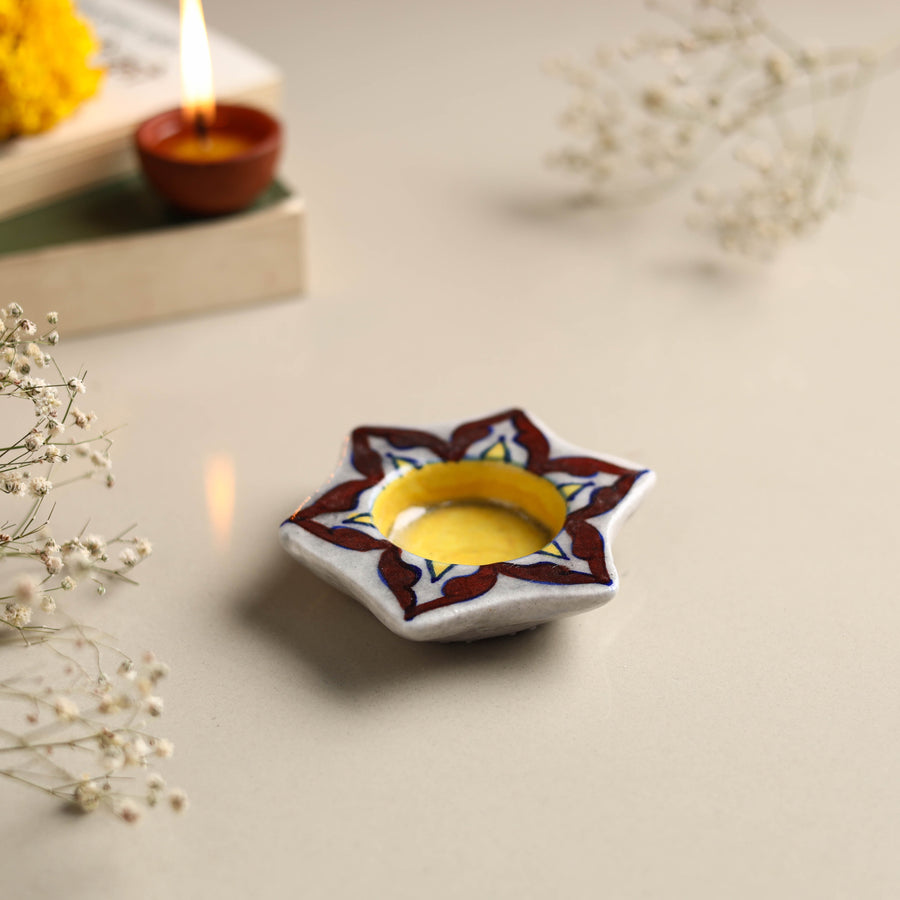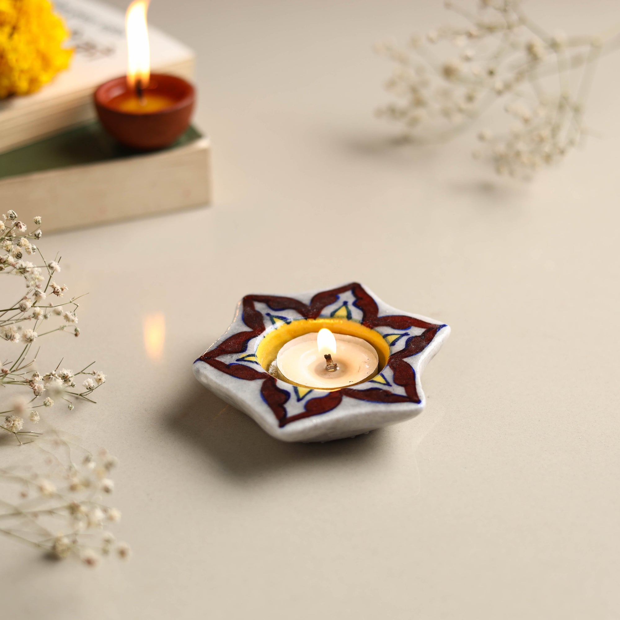 Elevate your space with this white original blue pottery ceramic tealight candle holder handmade by skilled artisans from rajasthan. A reflection of India rich pottery heritage this candle holder brings culture to any setting, whether for a festive gathering or a cozy night in.
