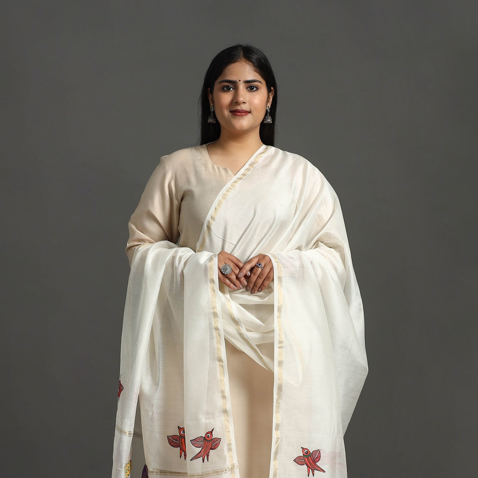 Fine quality white traditional chanderi silk-cotton pure handloom dupatta with intricate zari weaving along with original work of gond art by master artisan choti Tekam, made using fabric colors and permanent ink. Chanderi silks are known for its gossamer looks and amazing feel.