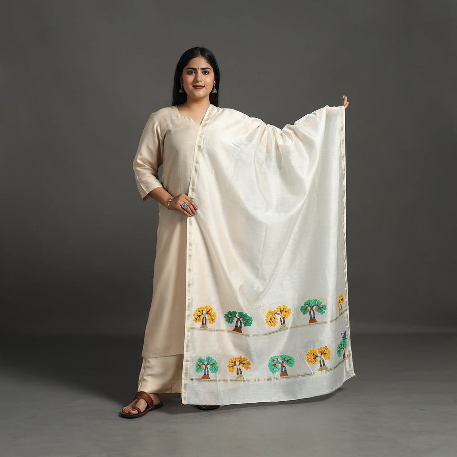 Fine quality white traditional chanderi silk-cotton pure handloom dupatta with intricate zari weaving along with original work of gond art by master artisan choti Tekam, made using fabric colors and permanent ink. Chanderi silks are known for its gossamer looks and amazing feel.
