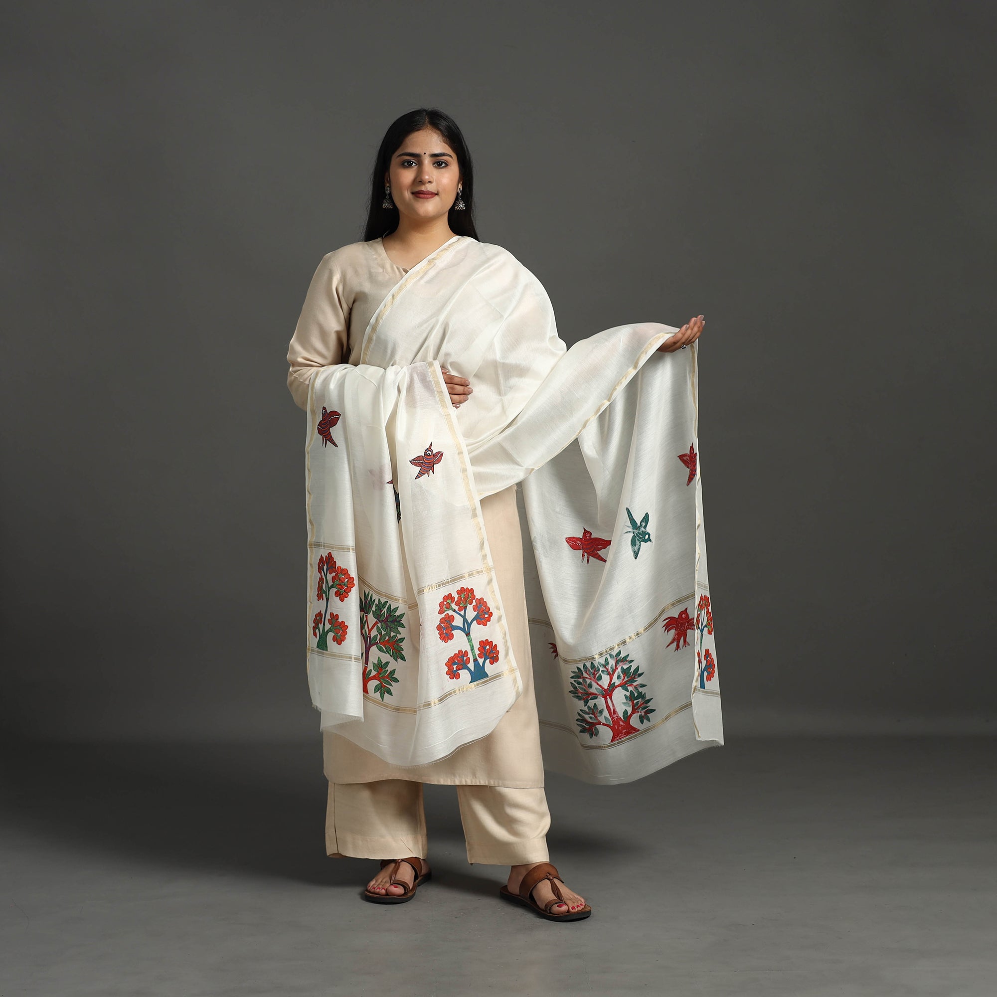 Fine quality traditional white chanderi silk-cotton pure handloom dupatta with intricate zari weaving along with original work of gond art by master artisan choti Tekam, made using fabric colors and permanent ink. Chanderi silks are known for its gossamer looks and amazing feel.