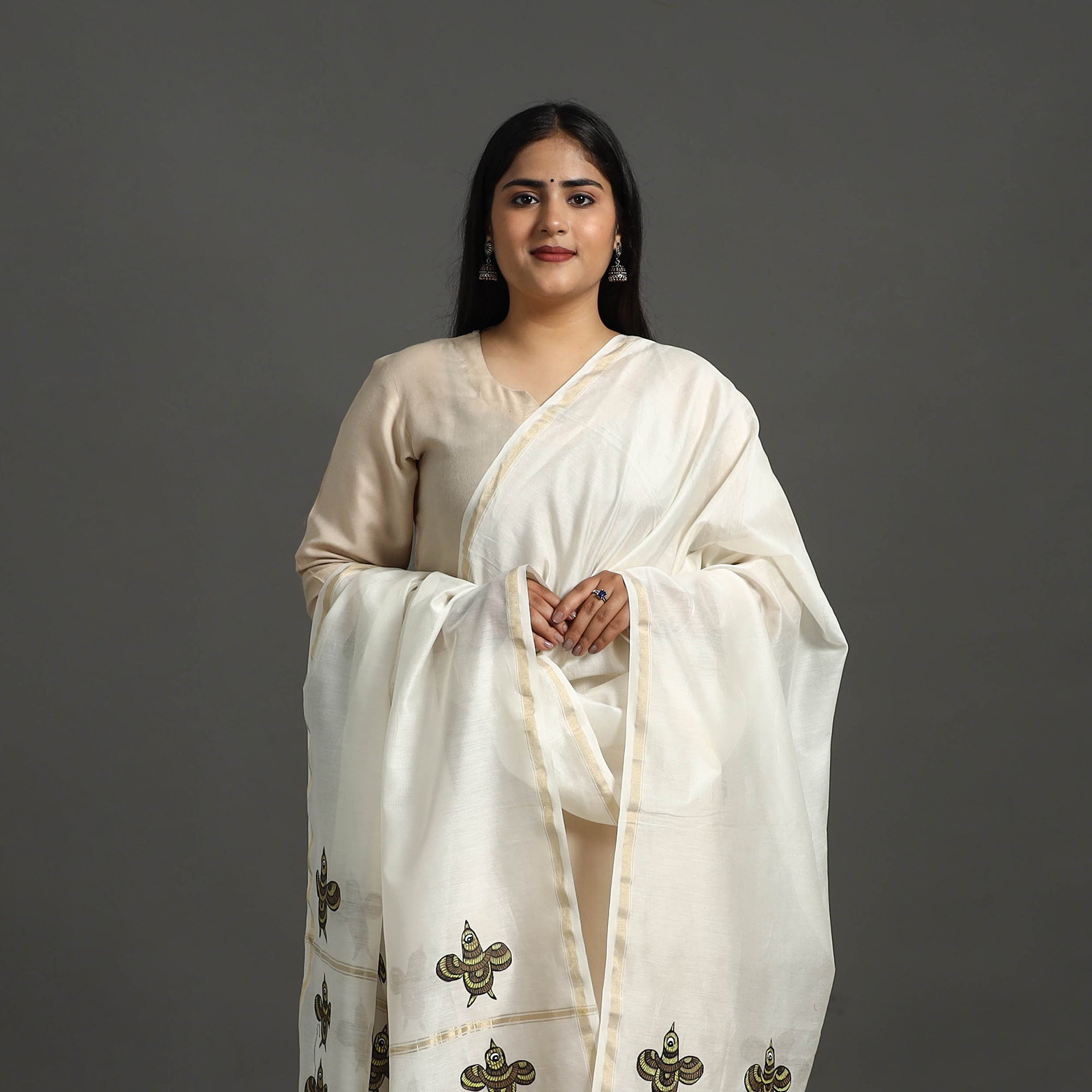 Fine quality white traditional chanderi silk-cotton pure handloom dupatta with intricate zari weaving along with original work of gond art by master artisan choti Tekam, made using fabric colors and permanent ink. Chanderi silks are known for its gossamer looks and amazing feel.