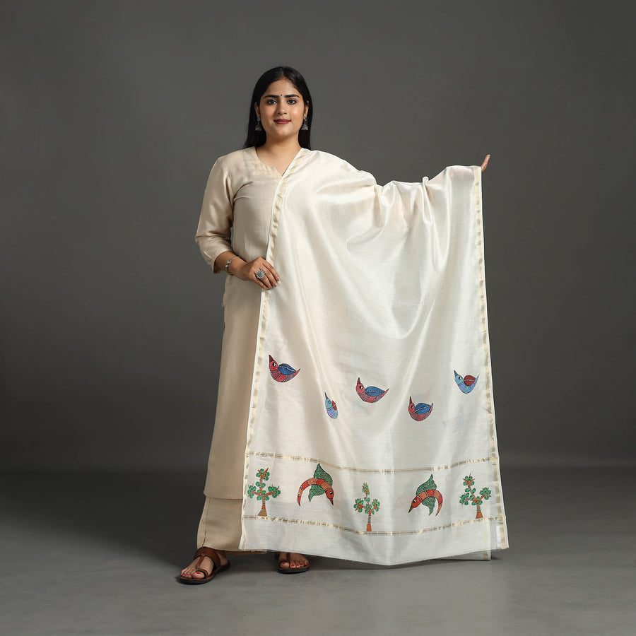 Fine quality white traditional chanderi silk-cotton pure handloom dupatta with intricate zari weaving along with original work of gond art by master artisan choti Tekam, made using fabric colors and permanent ink. Chanderi silks are known for its gossamer looks and amazing feel.
