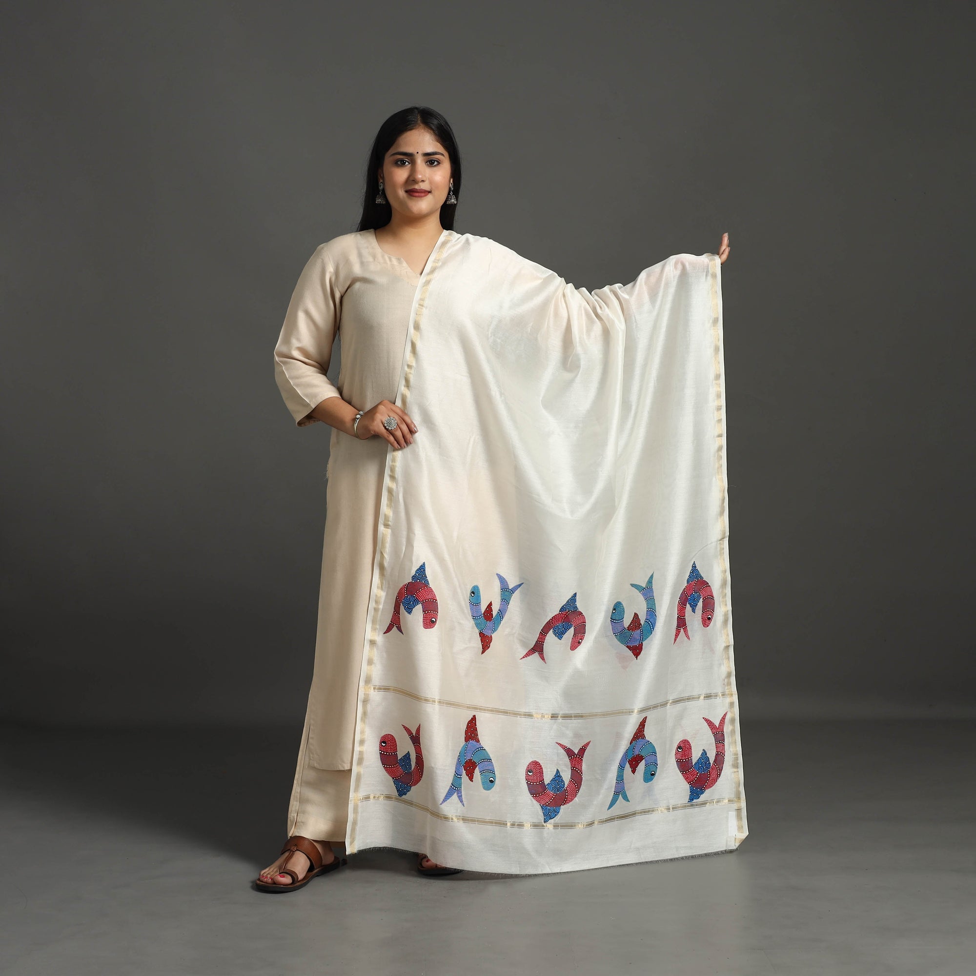 Fine quality white traditional chanderi silk-cotton pure handloom dupatta with intricate zari weaving along with original work of gond art by master artisan choti Tekam, made using fabric colors and permanent ink. Chanderi silks are known for its gossamer looks and amazing feel.