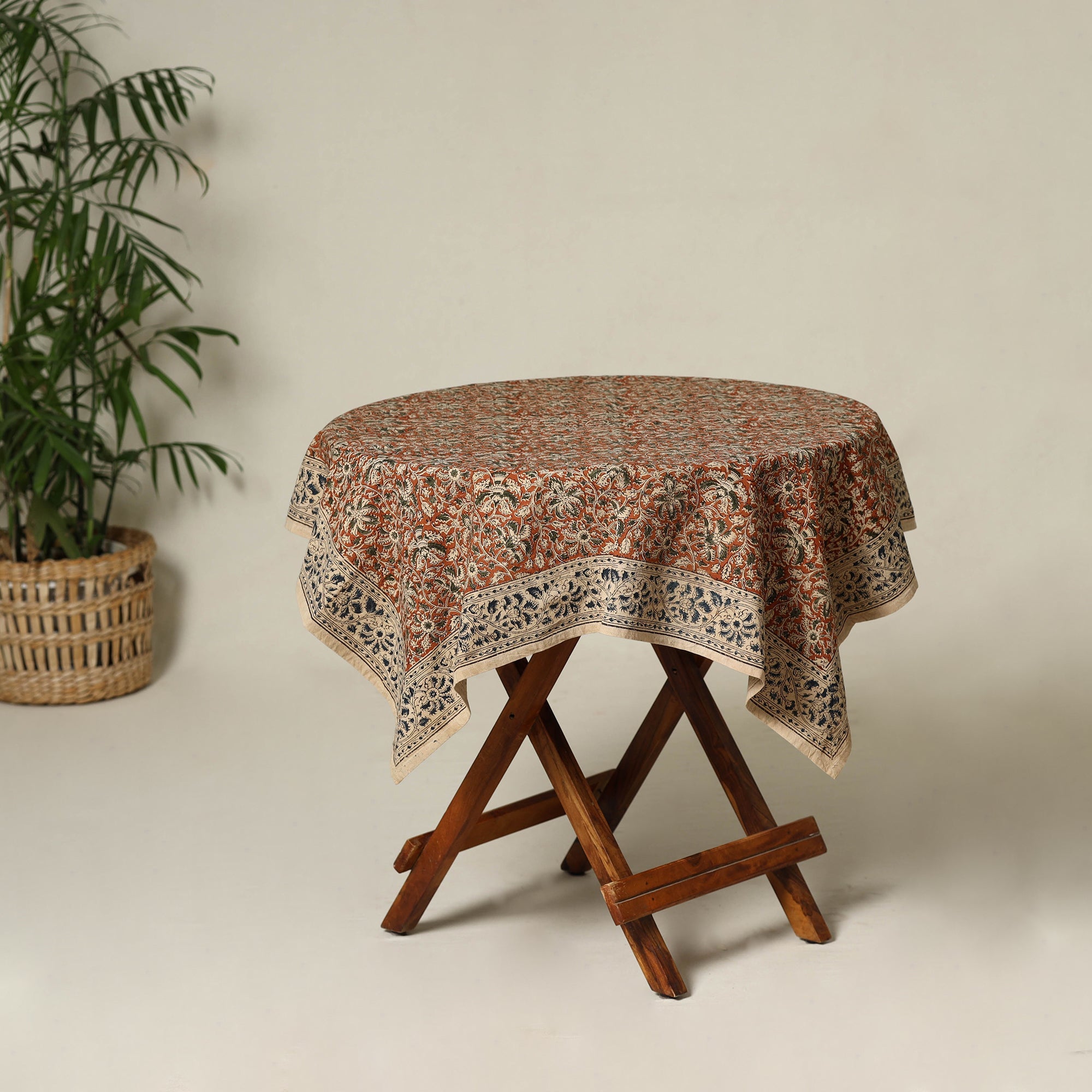 Elevate your dining experience with our orange pedana kalamkari hand block print table cover. Meticulously crafted by skilled artisans, this fine-quality cotton cover features intricate motifs created using natural dyes. Its rich aesthetic adds an elegant touch to any dining space, making it perfect for both everyday use and special gatherings.