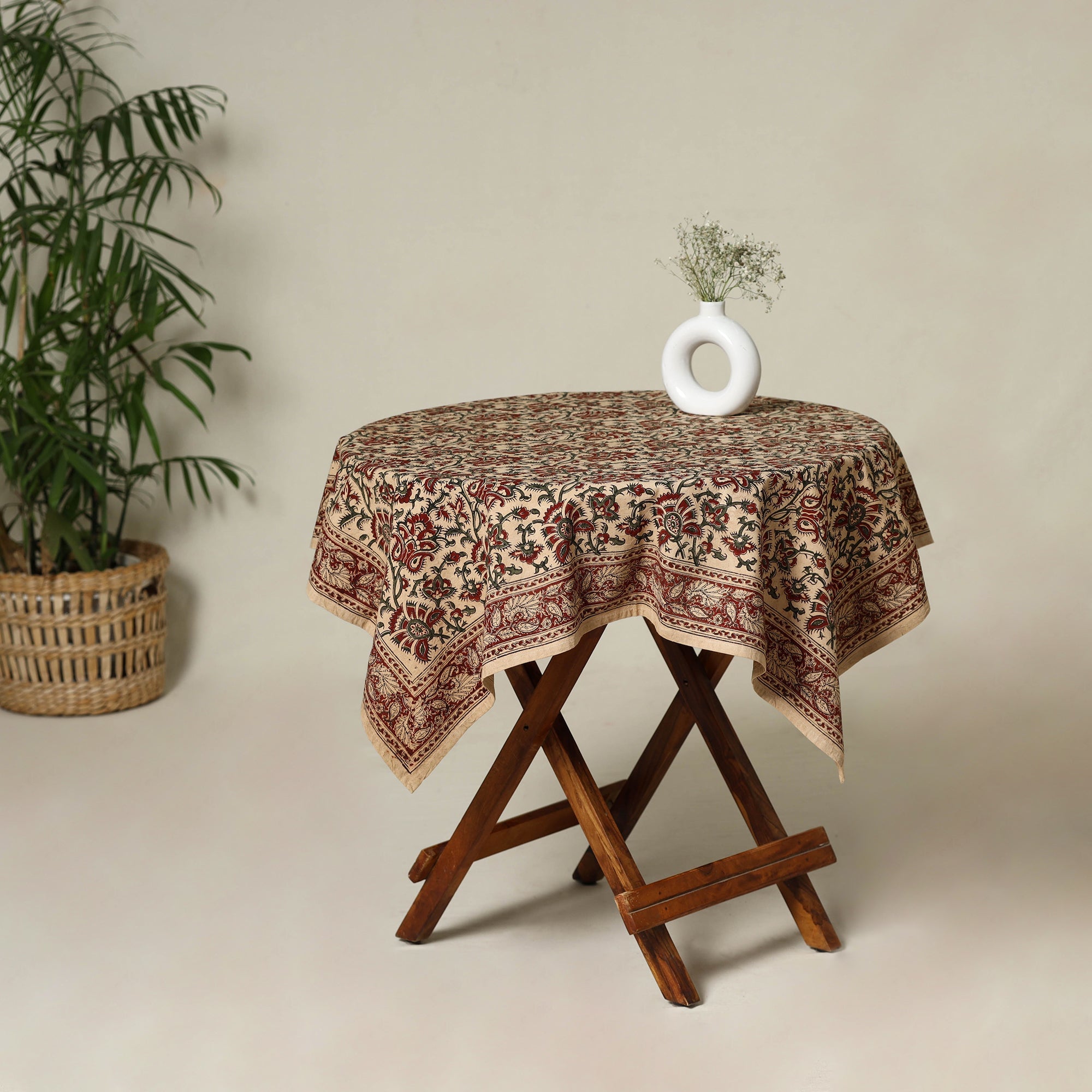 Elevate your dining experience with our beige pedana kalamkari hand block print table cover. Meticulously crafted by skilled artisans, this fine-quality cotton cover features intricate motifs created using natural dyes. Its rich aesthetic adds an elegant touch to any dining space, making it perfect for both everyday use and special gatherings.