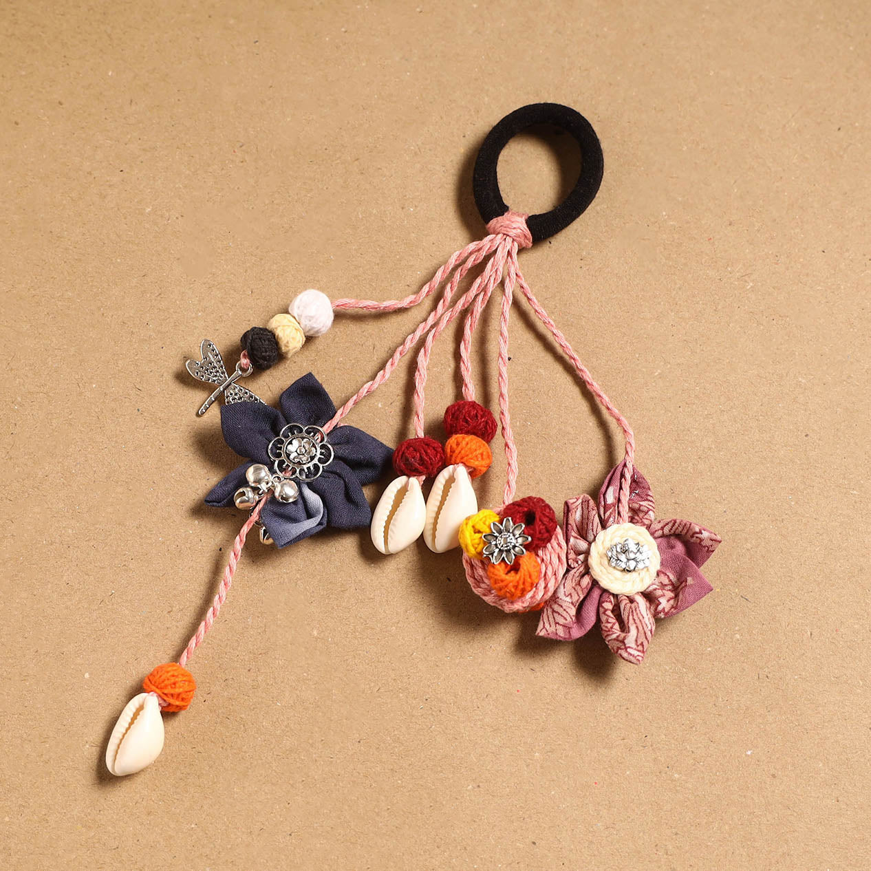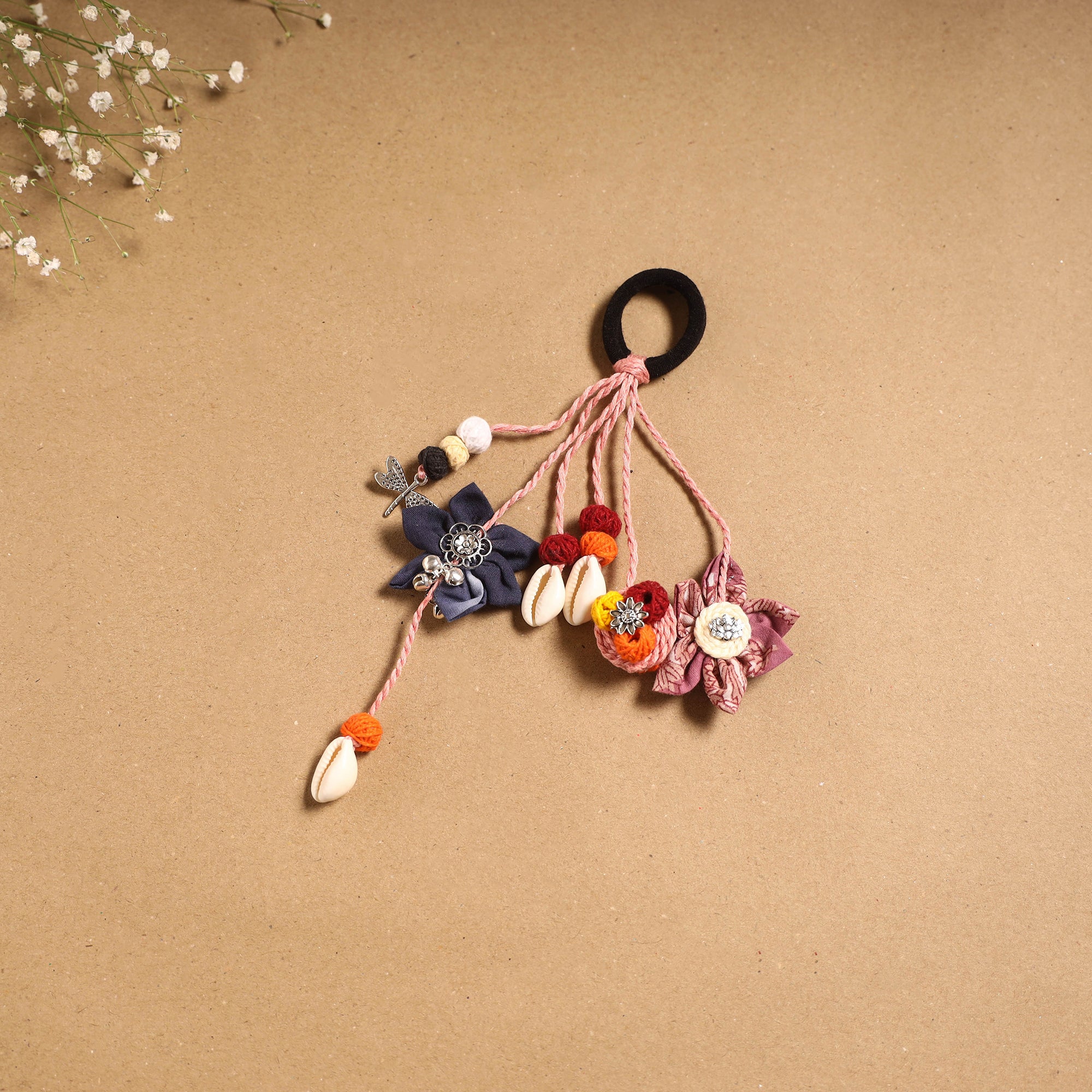 Handcrafted multicolor parandi-style hair rubber band made by skilled artisans. Created using threads and adorned with fabric elements, shells, thread beads and german silver detailing. A charming hair accessory for women and girls who love to incorporate traditional into their look.