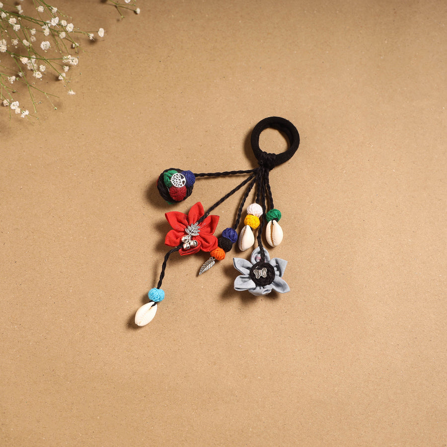Handcrafted multicolor parandi-style hair rubber band made by skilled artisans. Created using threads and adorned with fabric elements, shells, thread beads and german silver detailing. A charming hair accessory for women and girls who love to incorporate traditional into their look.