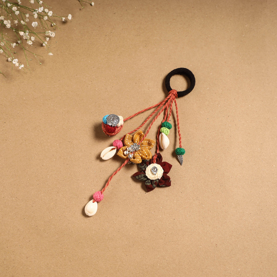 Handcrafted multicolor parandi-style hair rubber band made by skilled artisans. Created using threads and adorned with fabric elements, shells, thread beads and german silver detailing. A charming hair accessory for women and girls who love to incorporate traditional into their look.