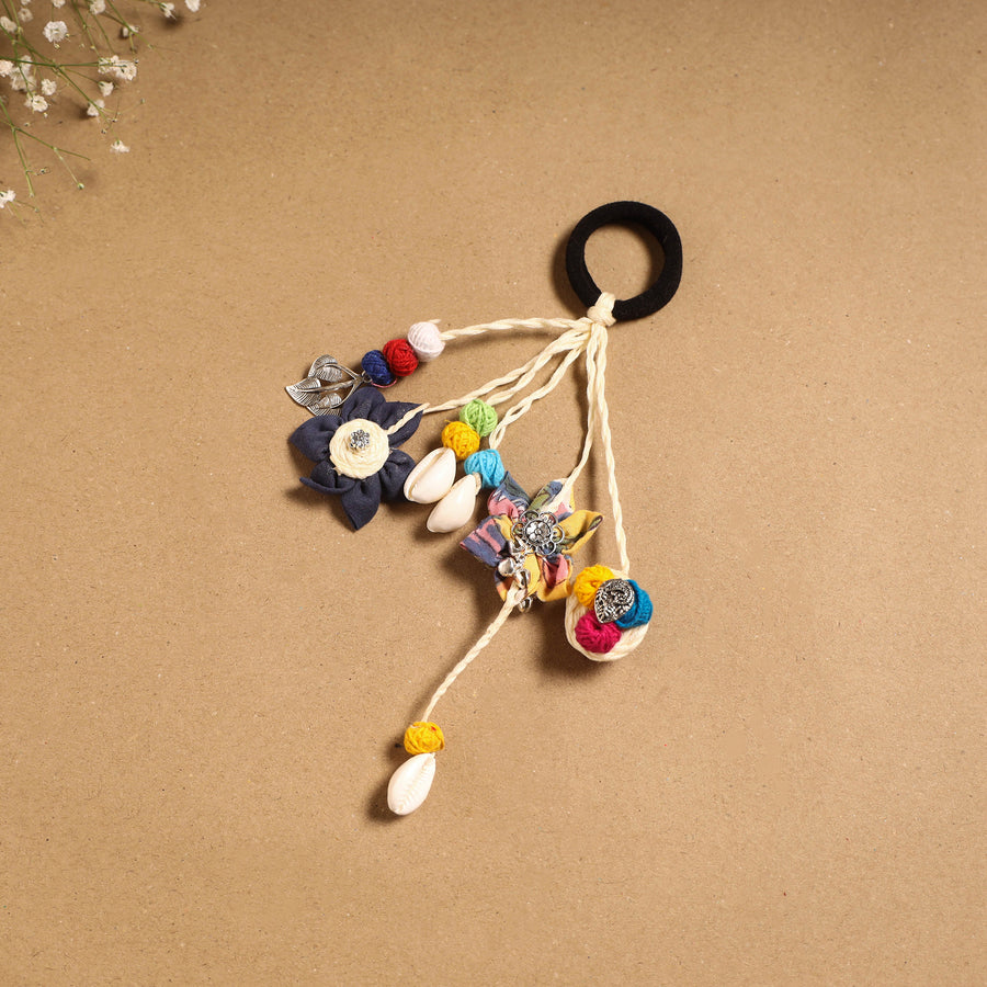 Handcrafted multicolor parandi-style hair rubber band made by skilled artisans. Created using threads and adorned with fabric elements, shells, thread beads and german silver detailing. A charming hair accessory for women and girls who love to incorporate traditional into their look.