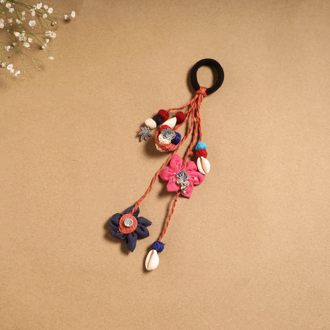Handcrafted multicolor parandi-style hair rubber band made by skilled artisans. Created using threads and adorned with fabric elements, shells, thread beads and german silver detailing. A charming hair accessory for women and girls who love to incorporate traditional into their look.