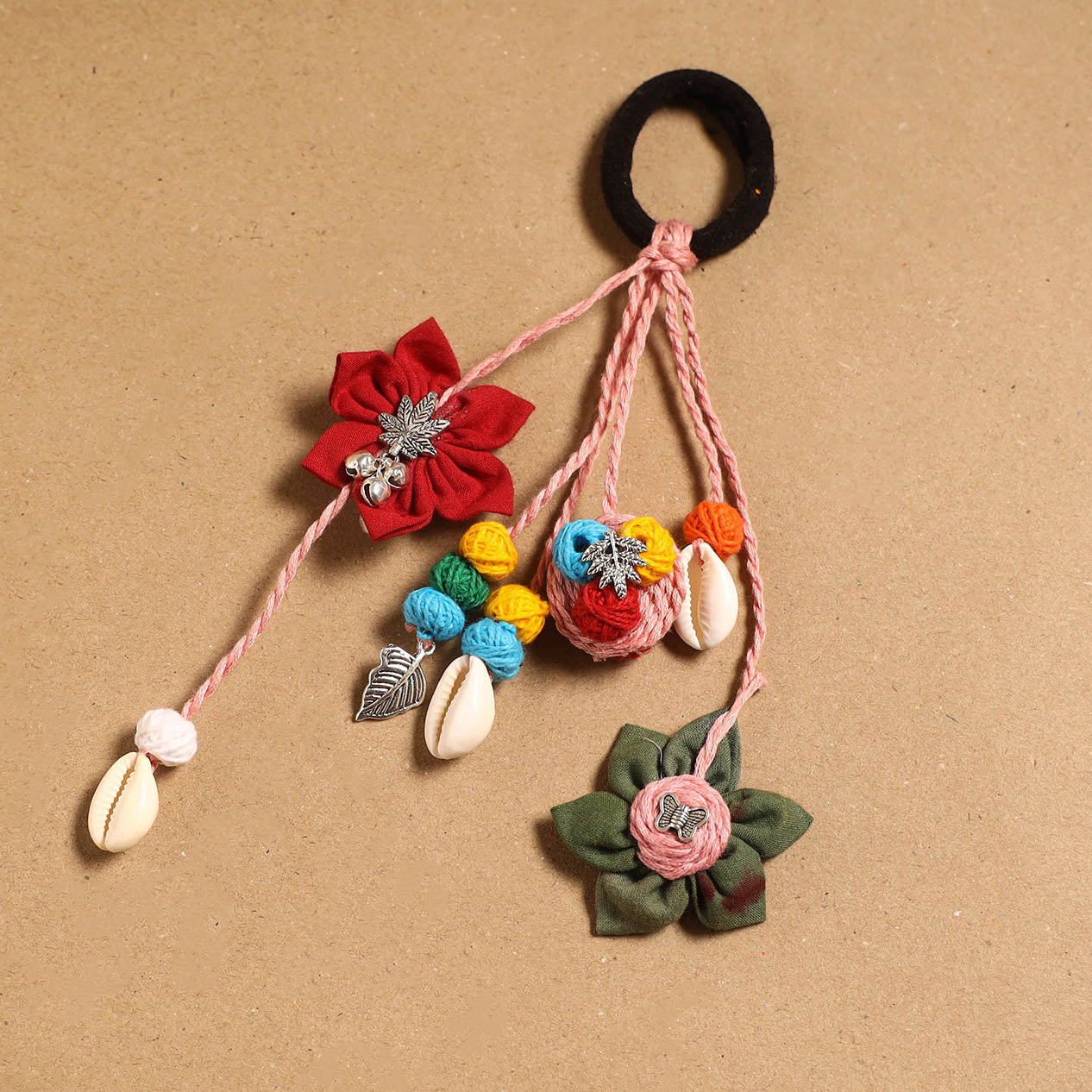 Handcrafted multicolor parandi-style hair rubber band made by skilled artisans. Created using threads and adorned with fabric elements, shells, thread beads and german silver detailing. A charming hair accessory for women and girls who love to incorporate traditional into their look.