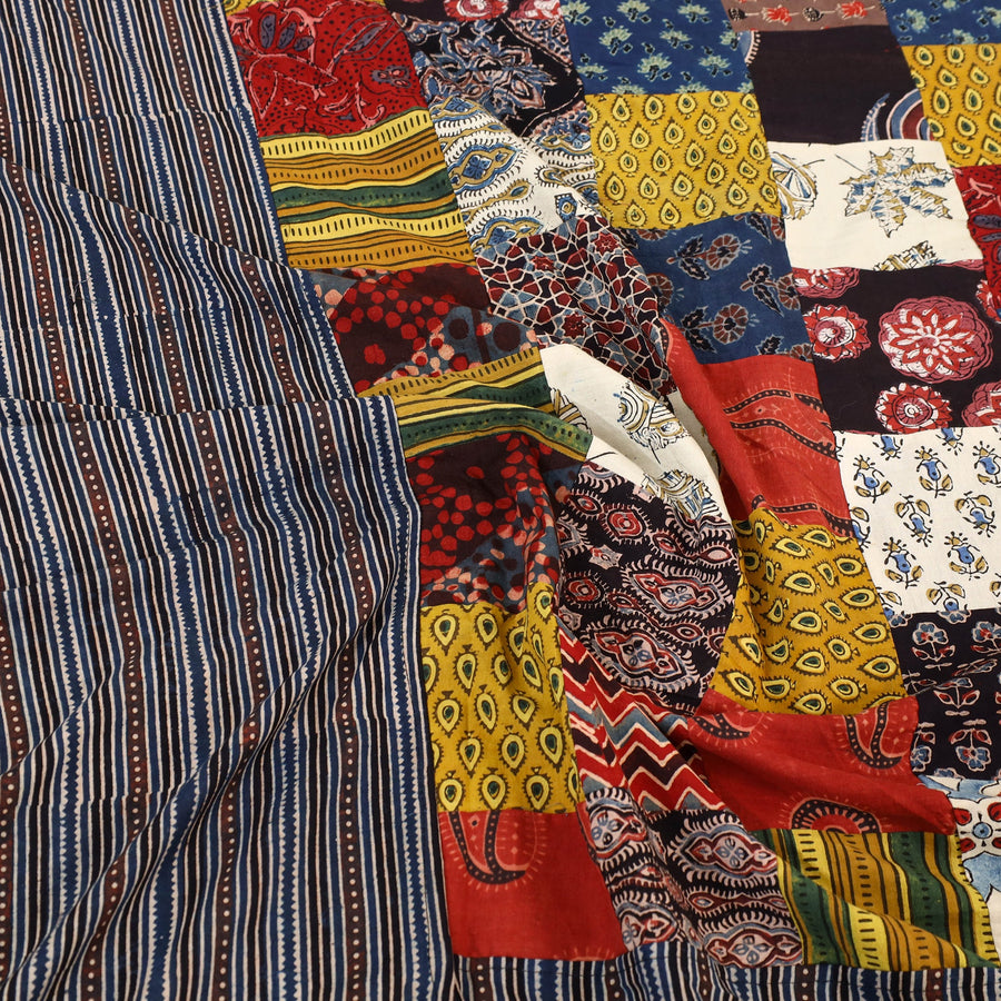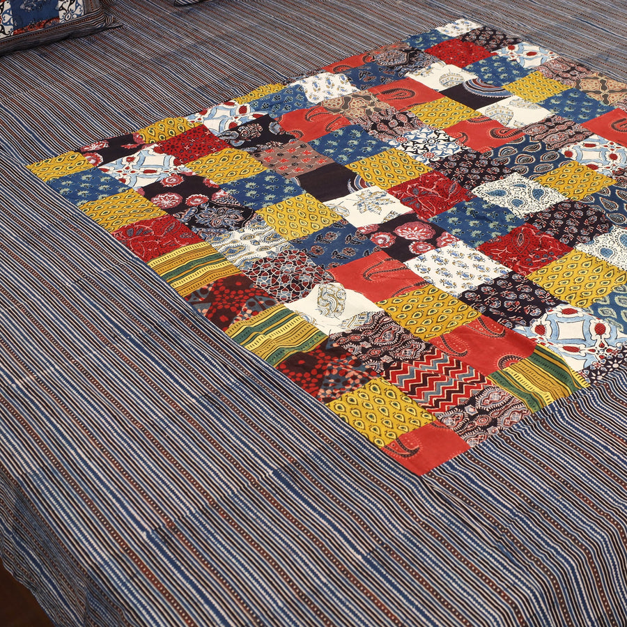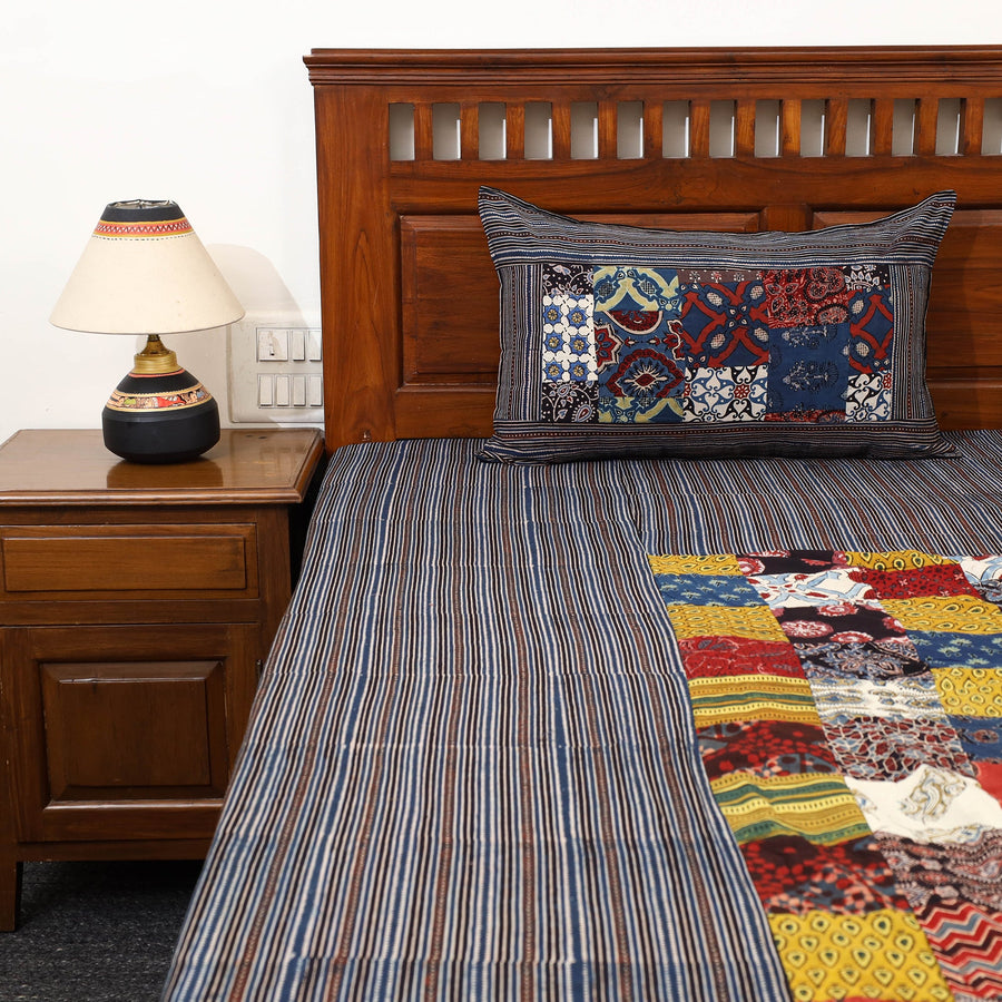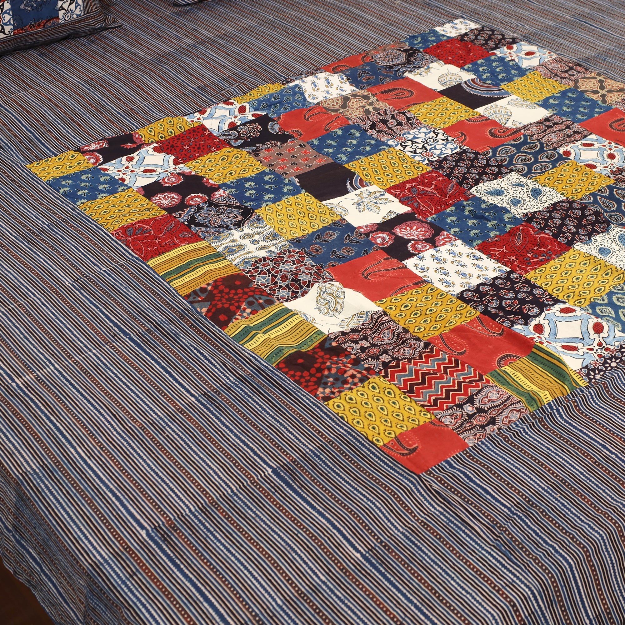 Transform your bedroom with this handcrafted black patchwork block print ajrakh cotton double bed sheet set, featuring traditional patterns and vibrant patchwork. Crafted from natural dyed cotton, it offers comfort and style. Ajrakh printing, a centuries-old craft from Gujarat and Rajasthan, ensures each piece is a unique cultural treasure. Perfect for elegant home décor, this set includes matching pillow covers.