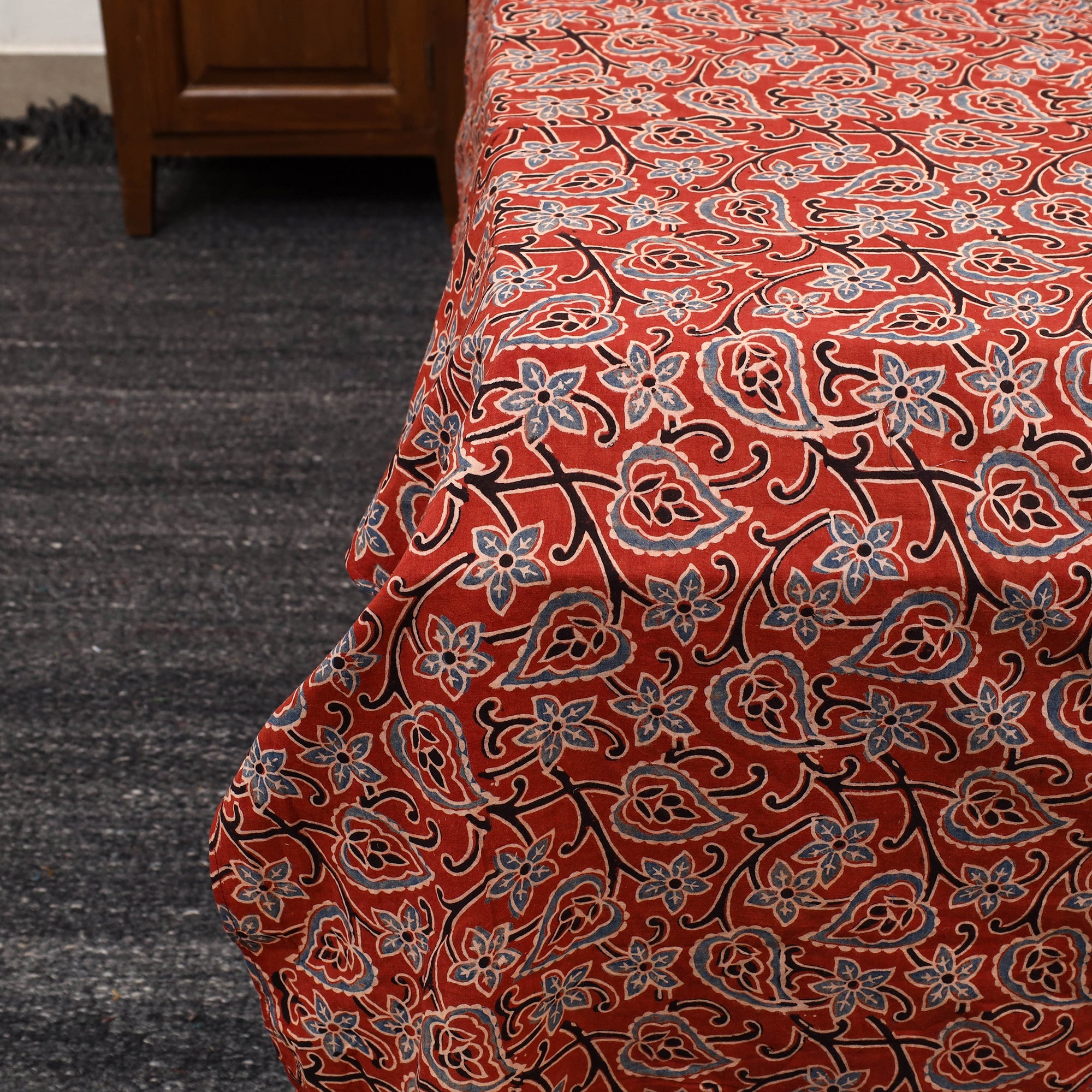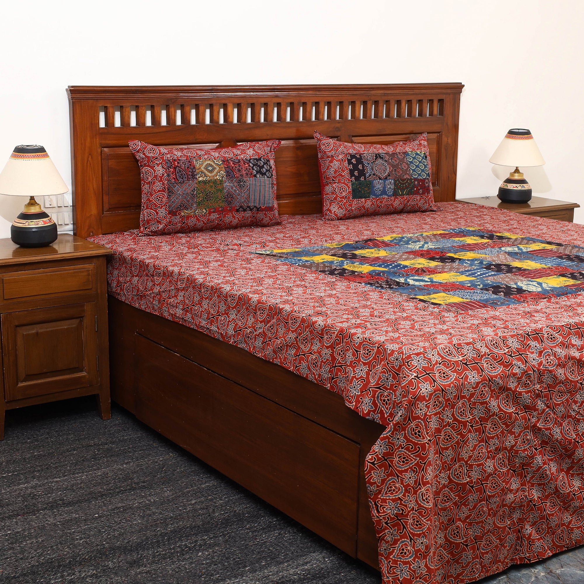 Transform your bedroom with this red handcrafted patchwork block print ajrakh cotton double bed sheet set, featuring traditional patterns and vibrant patchwork. Crafted from natural dyed cotton, it offers comfort and style. Ajrakh printing, a centuries-old craft from Gujarat and Rajasthan, ensures each piece is a unique cultural treasure. Perfect for elegant home décor, this set includes matching pillow covers.