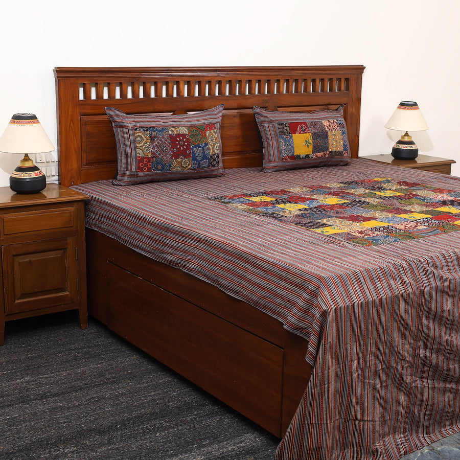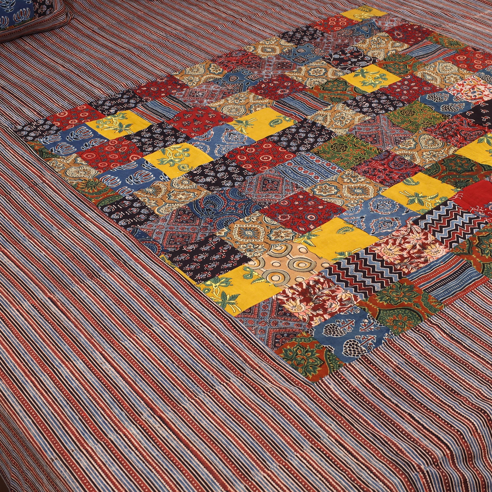 Transform your bedroom with this maroon handcrafted patchwork block print ajrakh cotton double bed sheet set, featuring traditional patterns and vibrant patchwork. Crafted from natural dyed cotton, it offers comfort and style. Ajrakh printing, a centuries-old craft from Gujarat and Rajasthan, ensures each piece is a unique cultural treasure. Perfect for elegant home décor, this set includes matching pillow covers.