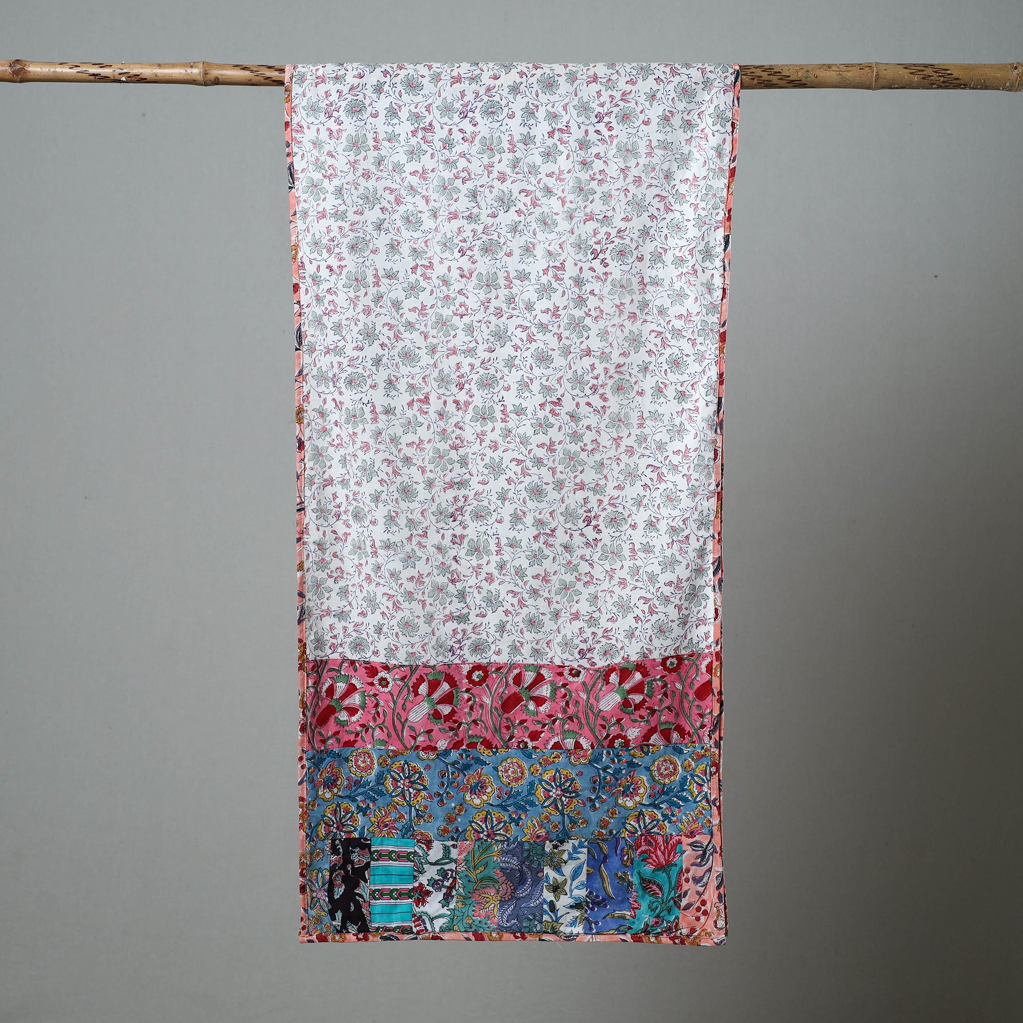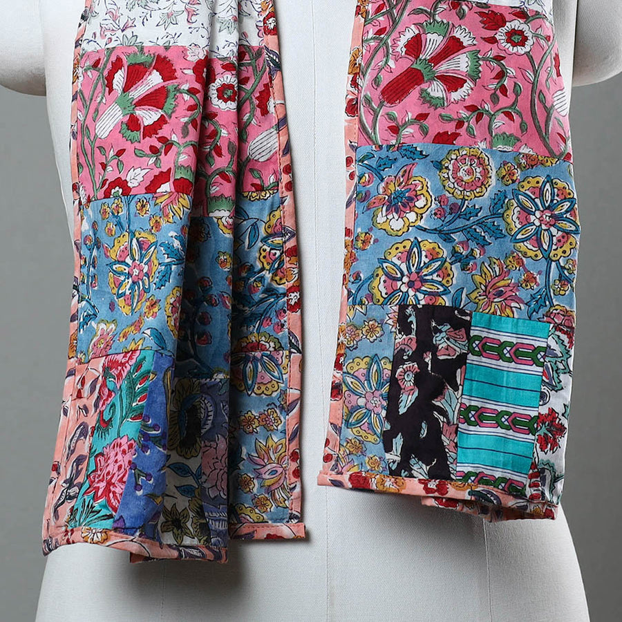 Elevate your style with the multicolor patchwork block printed cotton sanganeri stole, a handcrafted masterpiece that carries the tradition of Rajasthan's Sanganeri block prints. Made with cotton, this stole features floral motifs created using traditional printing techniques passed down through generations. A versatile accessory, it adds a touch of culture and sustainability to any outfit.