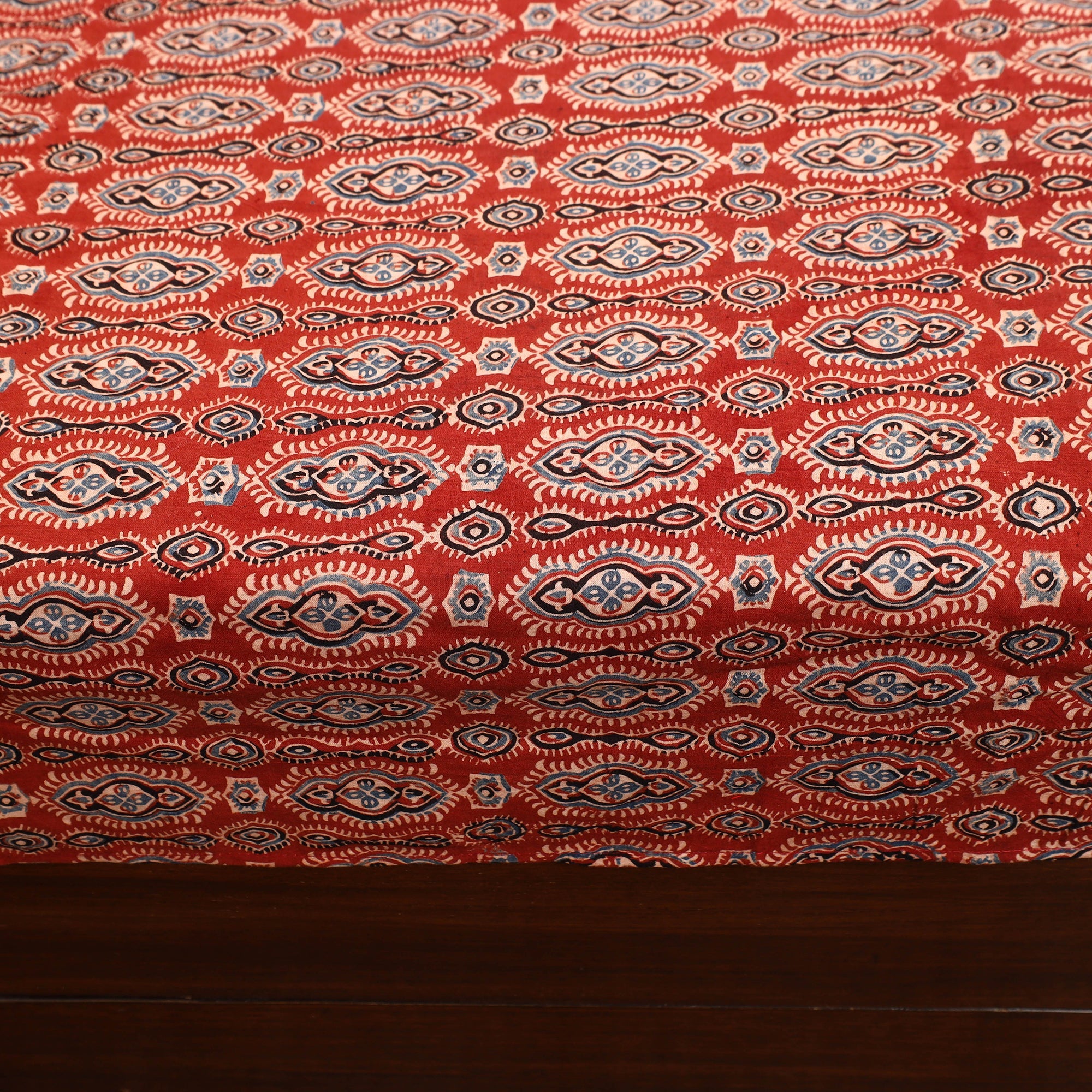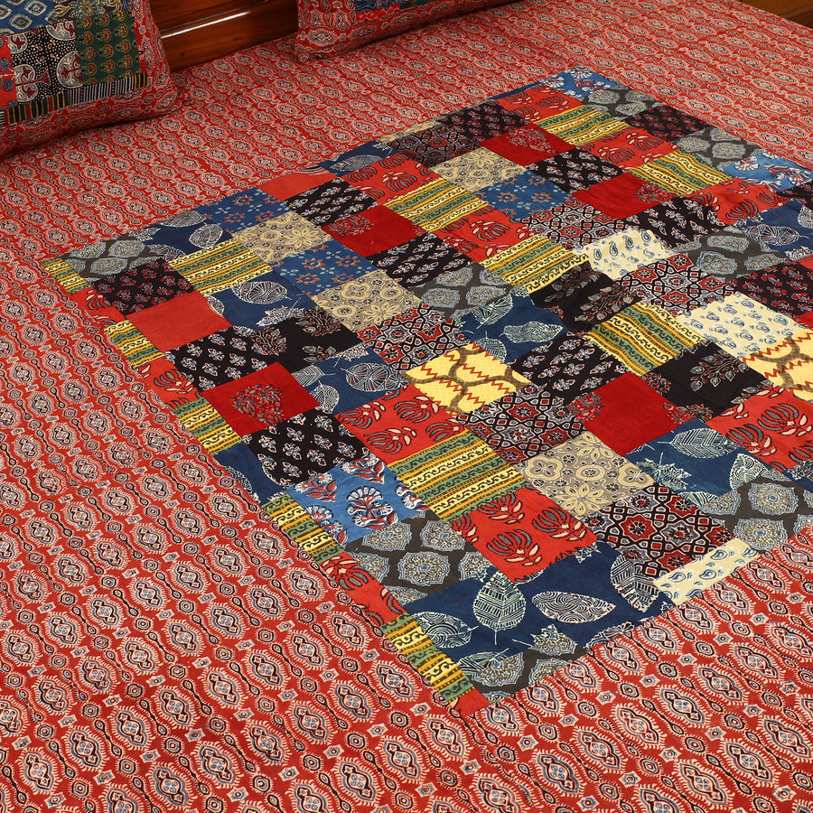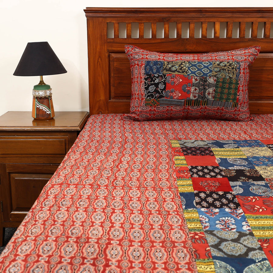 This red patchwork cotton double ajrakh bed sheet set brings a touch of Gujarat and Rajasthan’s rich cultural heritage into your home. The vibrant patchwork and hand block print design, made from natural-dyed cotton, make this bed sheet a unique piece of artisanal craftsmanship. Perfect for elegant home decor, this set includes matching pillow covers.