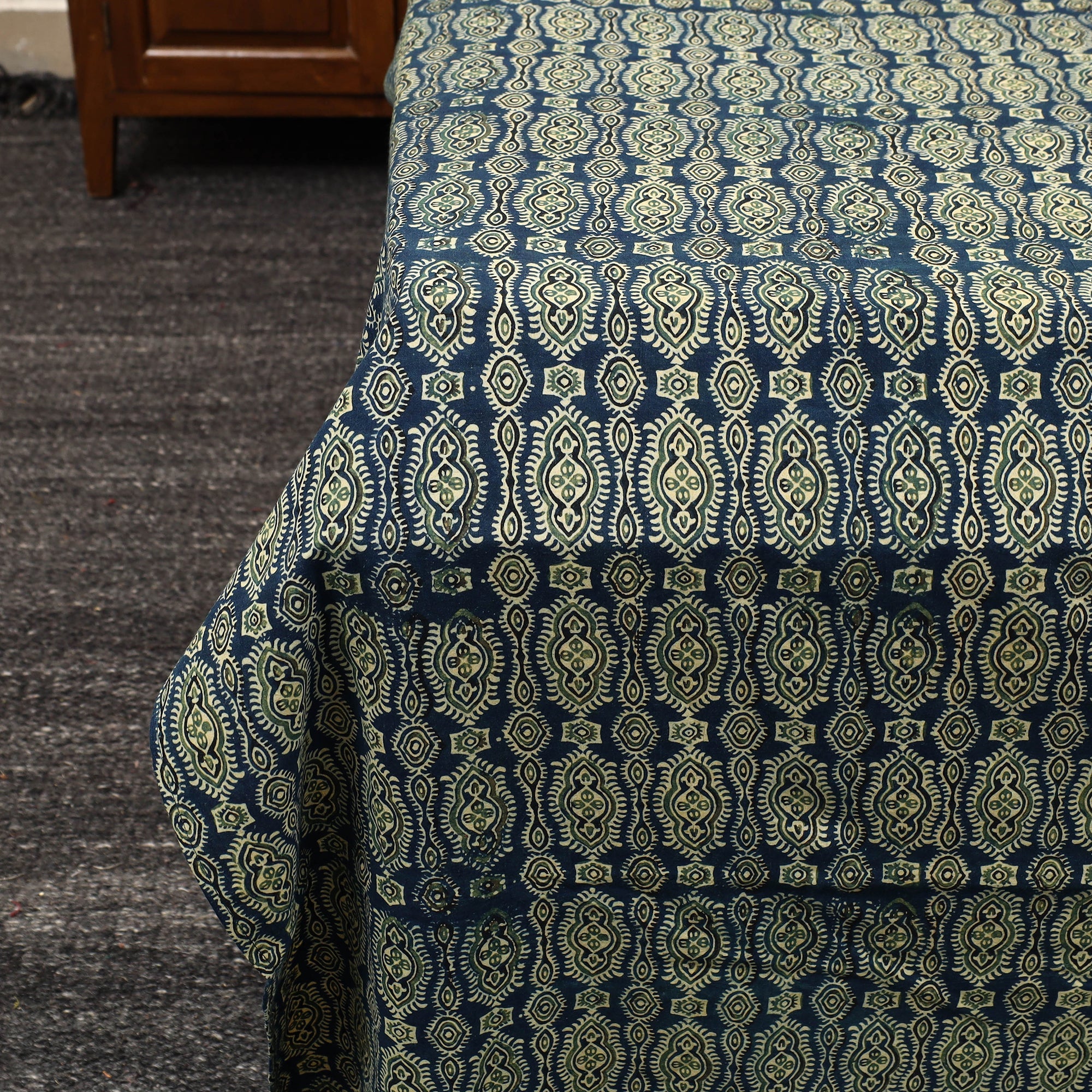 This patchwork cotton blue double ajrakh bed sheet set brings a touch of Gujarat and Rajasthan’s rich cultural heritage into your home. The vibrant patchwork and hand block print design, made from natural-dyed cotton, make this bed sheet a unique piece of artisanal craftsmanship. Perfect for elegant home decor, this set includes matching pillow covers.
