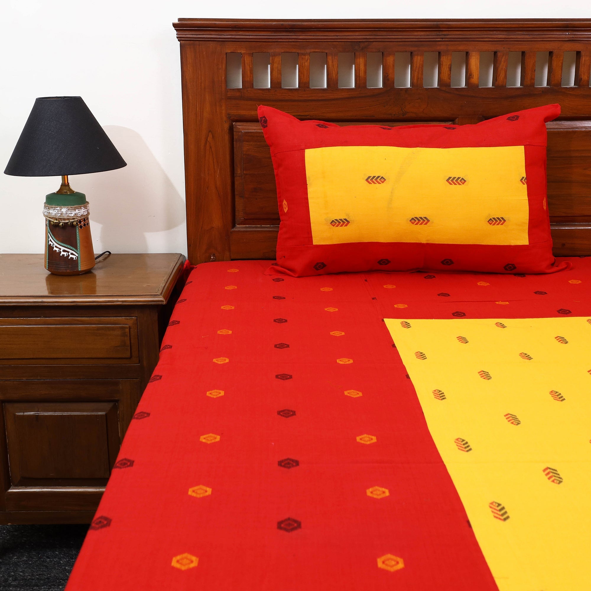 Elevate your bedroom decor with this beautifully crafted red patchwork cotton double jacquard bed sheet set, showcasing intricate patchwork designs along with coordinated pillow covers. Made from soft pure cotton, this jacquard bed sheet set perfectly blends style and comfort, adding a touch of elegance to your space.