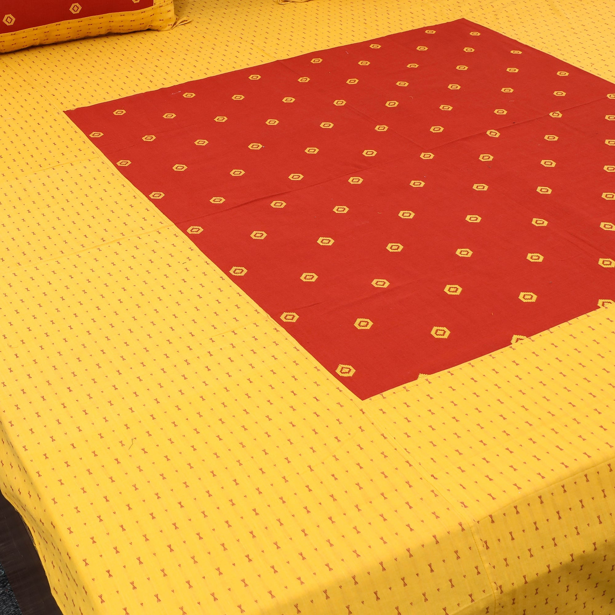 Elevate your bedroom decor with this beautifully crafted yellow patchwork cotton double jacquard bed sheet set, showcasing intricate patchwork designs along with coordinated pillow covers. Made from soft pure cotton, this jacquard bed sheet set perfectly blends style and comfort, adding a touch of elegance to your space.