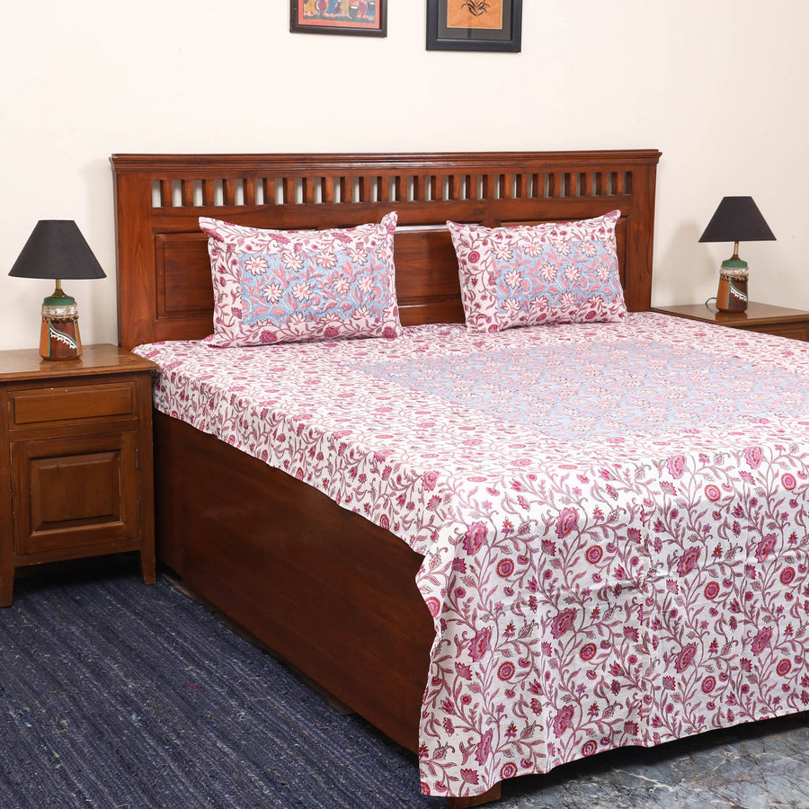 Pink patchwork hand block sanganeri print bedsheet set showcases the charm of Indian textile traditions. Crafted from cotton, it offers lasting comfort and durability. The intricate hand block print adds a refined, artistic appeal to the fabric. The set includes one double bedsheet and two matching pillow covers, making it perfect for adding a handmade touch to your room decor.