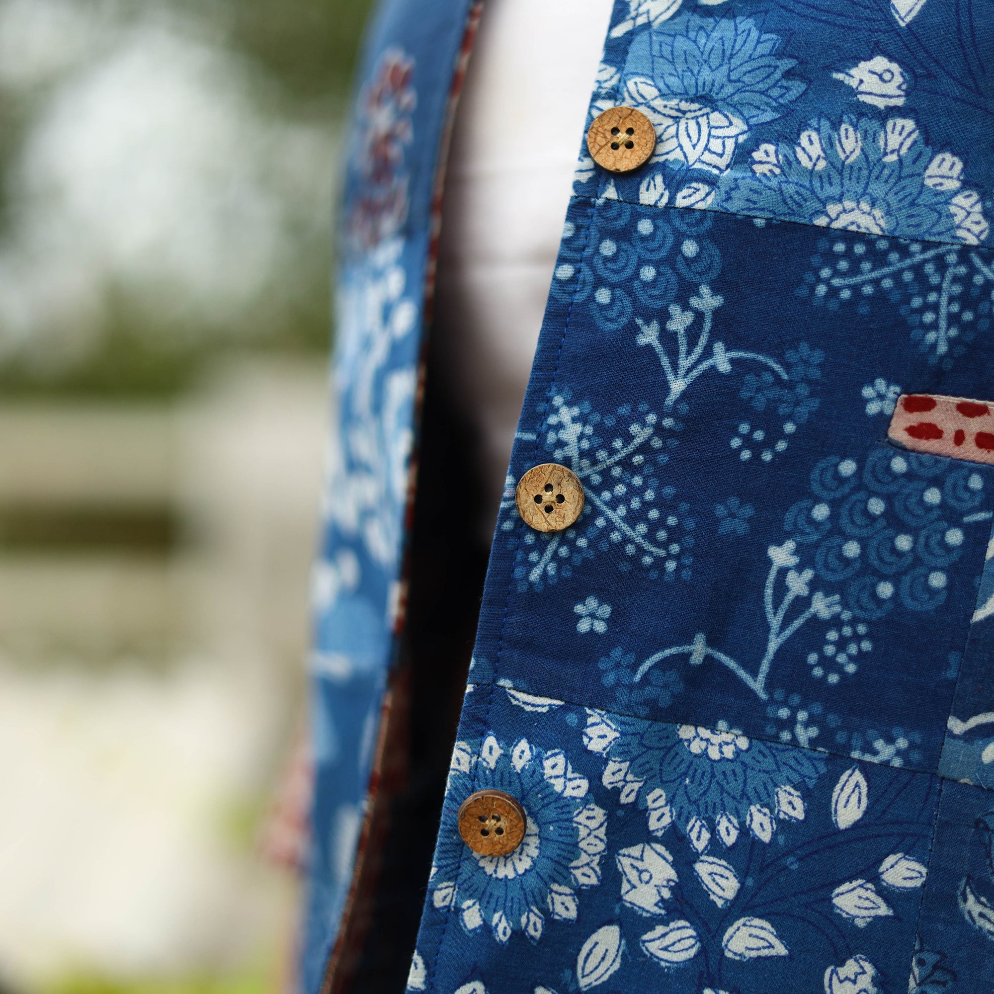 This patchwork blue bagru print women's jacket, crafted from, natural-dyed cotton, blends comfort with timeless design. Showcasing artisan-crafted bagru block prints and stitched patchwork, this jacket blends traditional artistry with modern design. Featuring a notched collar, functional pockets, and detailed stitching, it’s perfect for layering over kurtas, dresses, or casual outfits.