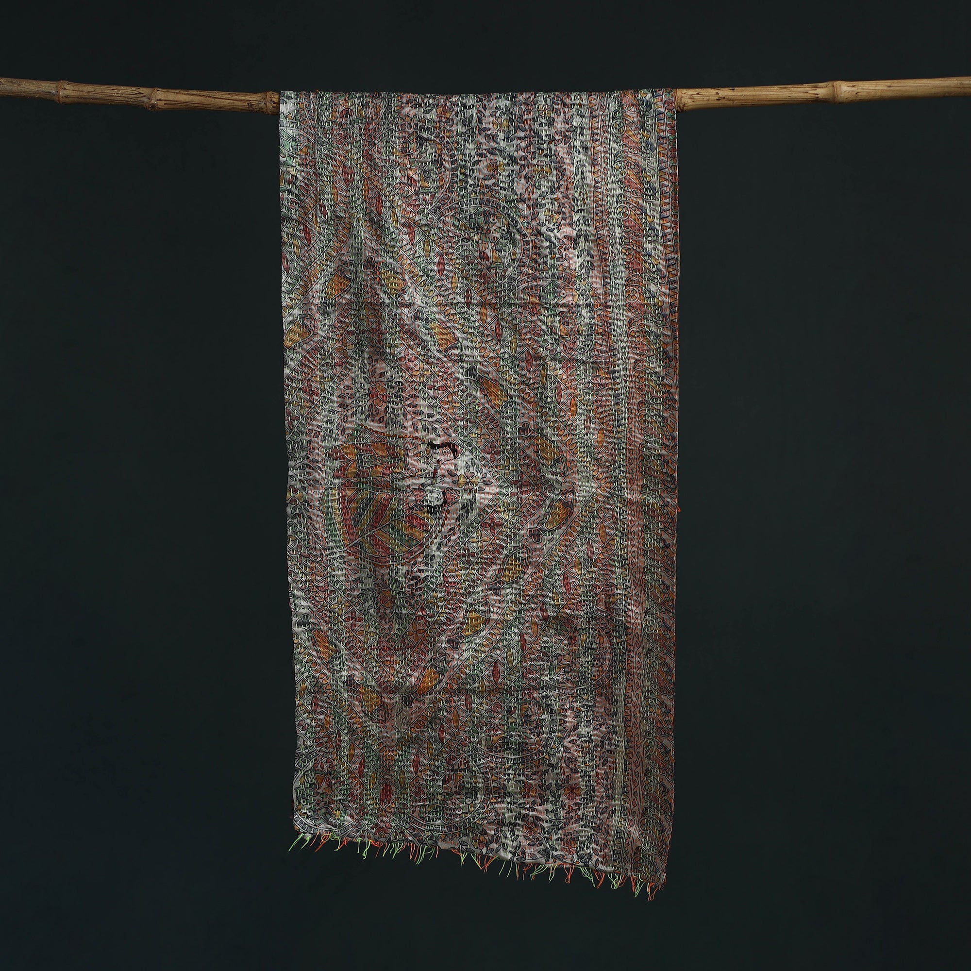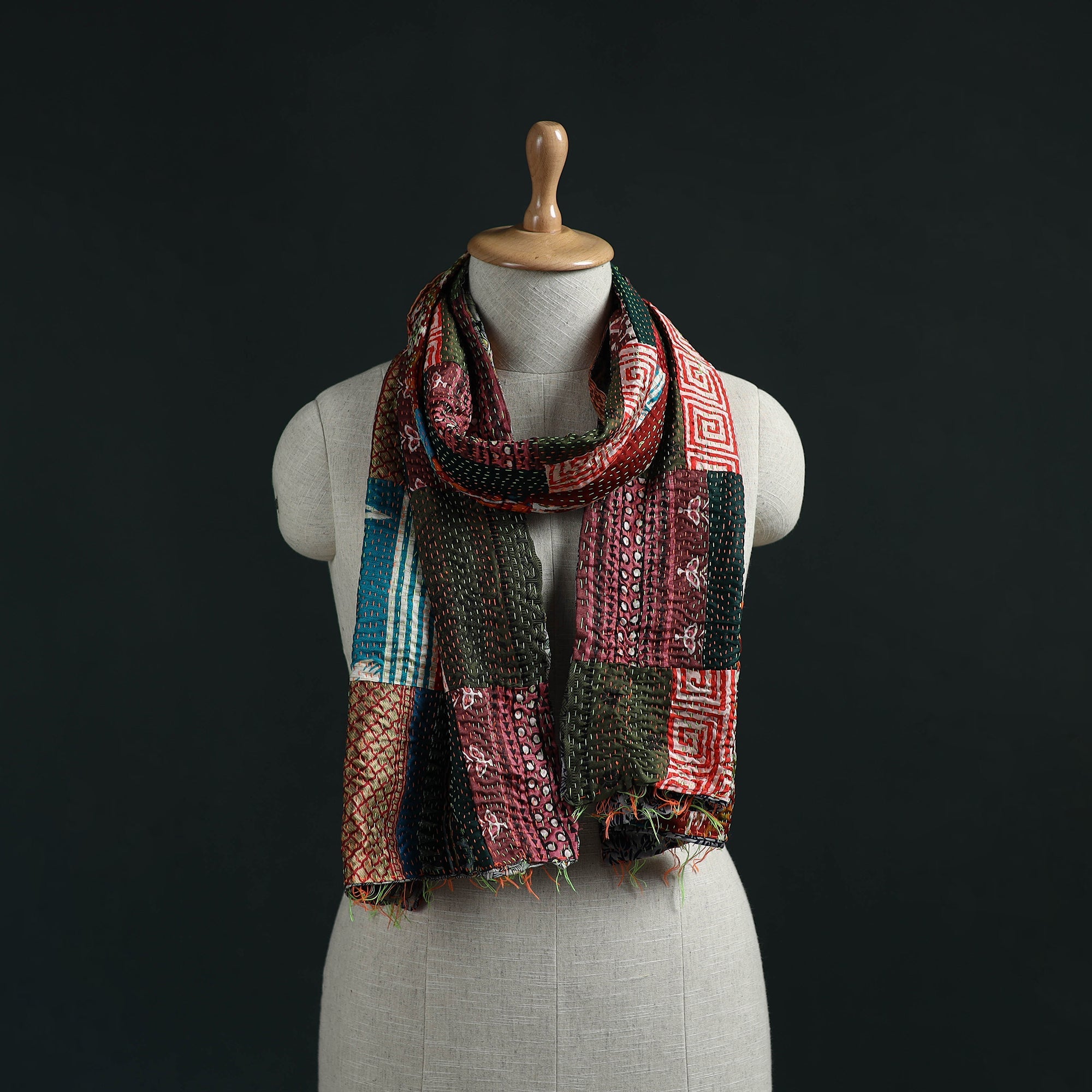 | Material | Multicolor kantha hand stitch patchwork art silk reversible stole, crafted by women artisans using sustainable stitching methods, is a tradition found in the rural regions of Bengal. The reversible design adds versatility, while the patchwork patterns and hand embroidery bring a unique charm with a contemporary touch. Perfect for casual wear, this stole pairs well with a wide range of outfits. |