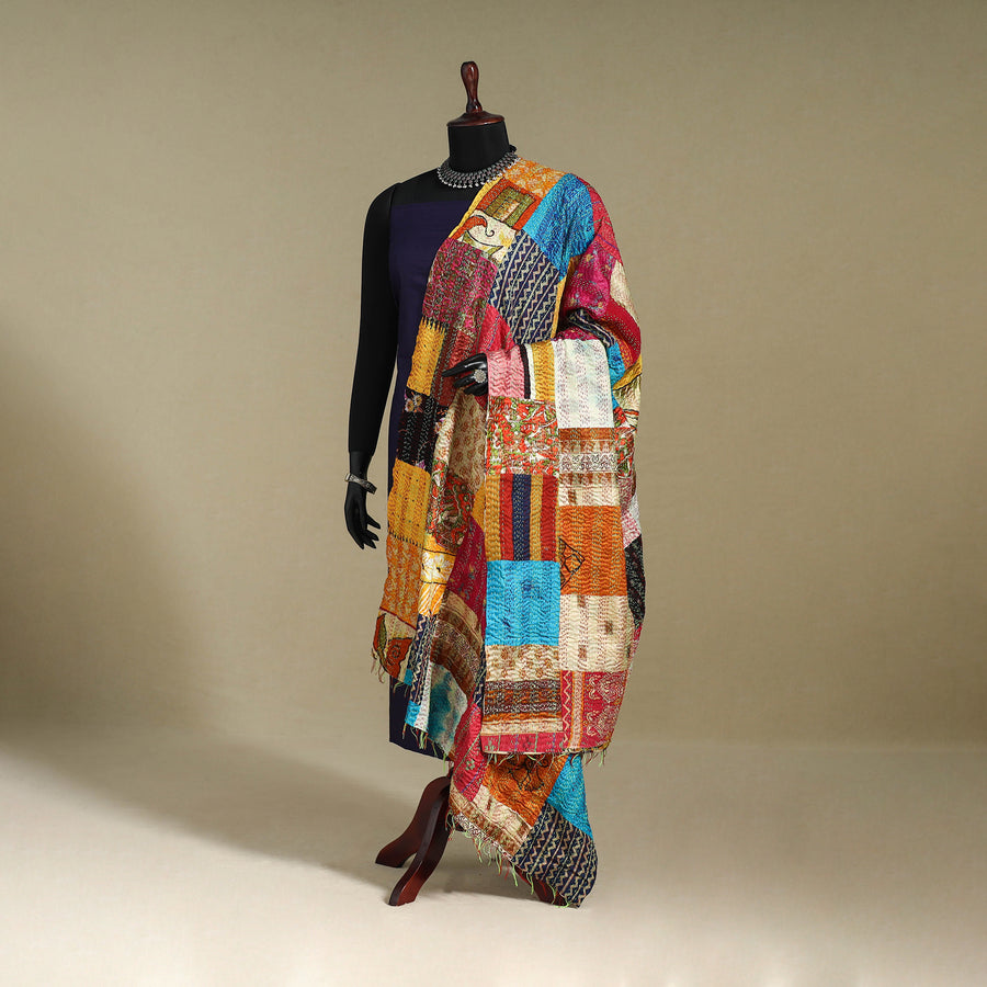 Multicolor - Patchwork Reversible Silk Bengal Kantha Work Dupatta 186