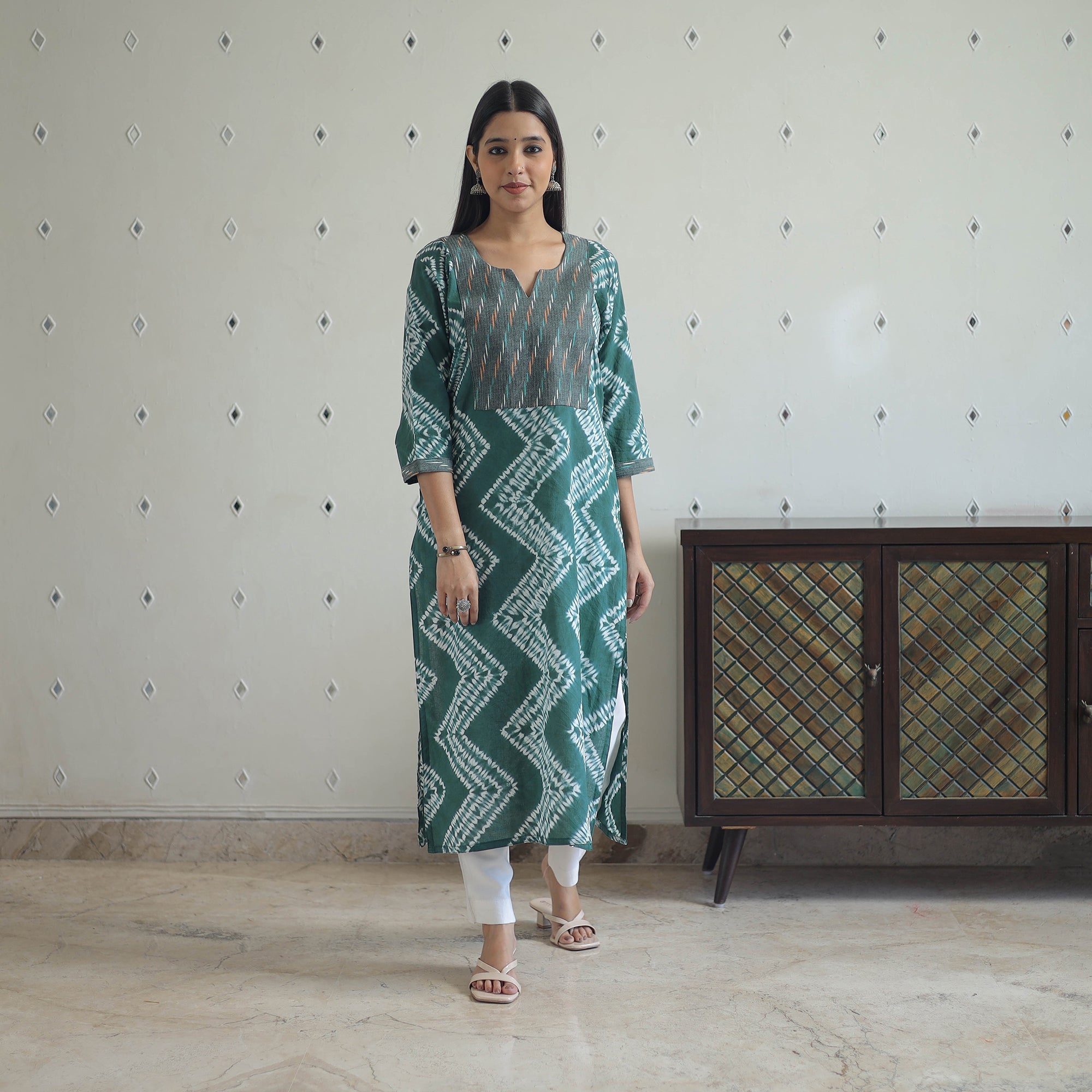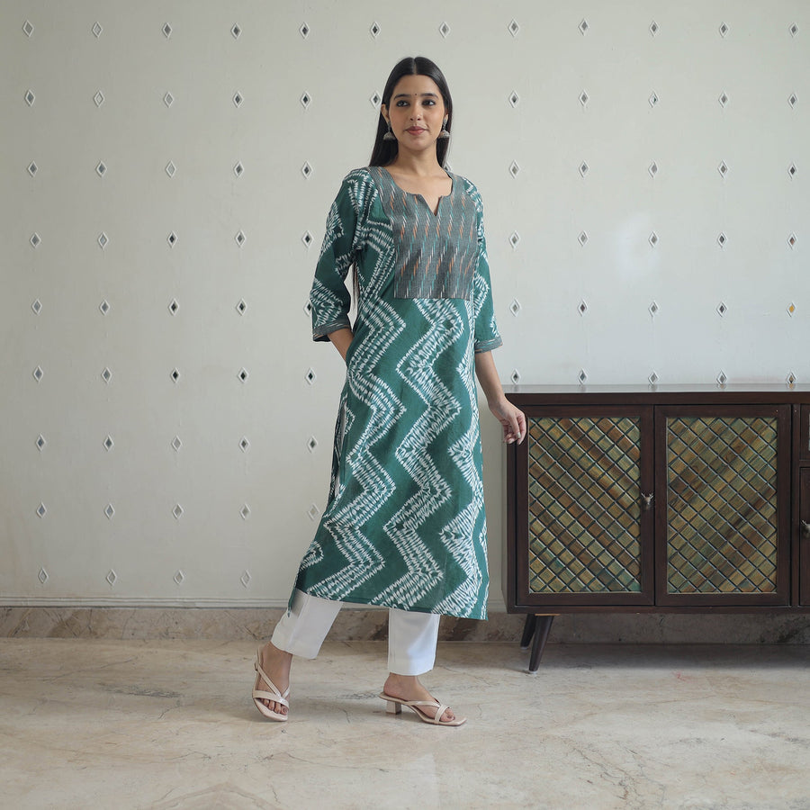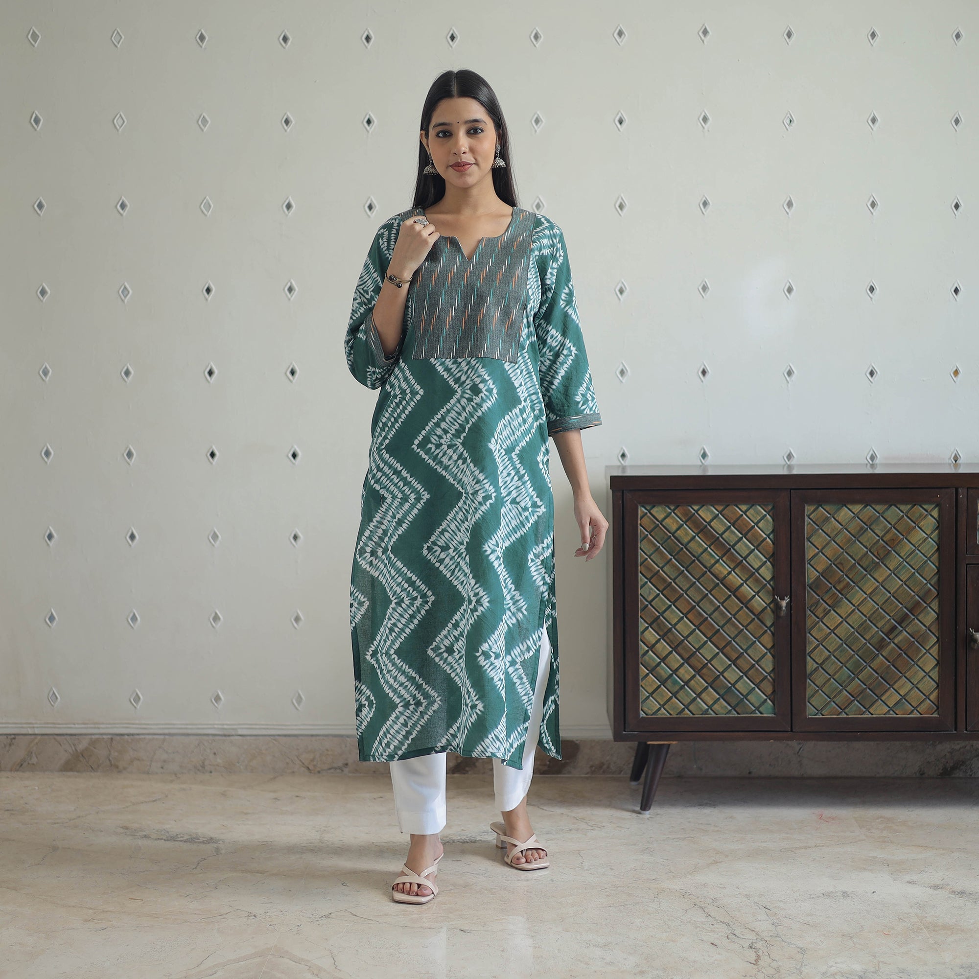 Embrace elegance with this green tie & dye cotton straight shibori kurta with Patchwork and one side pocket. Featuring a unique pattern created using traditional techniques, this kurta combines comfort with artistic flair. Perfect for all-day wear making it ideal for both casual and semi-formal occasions.