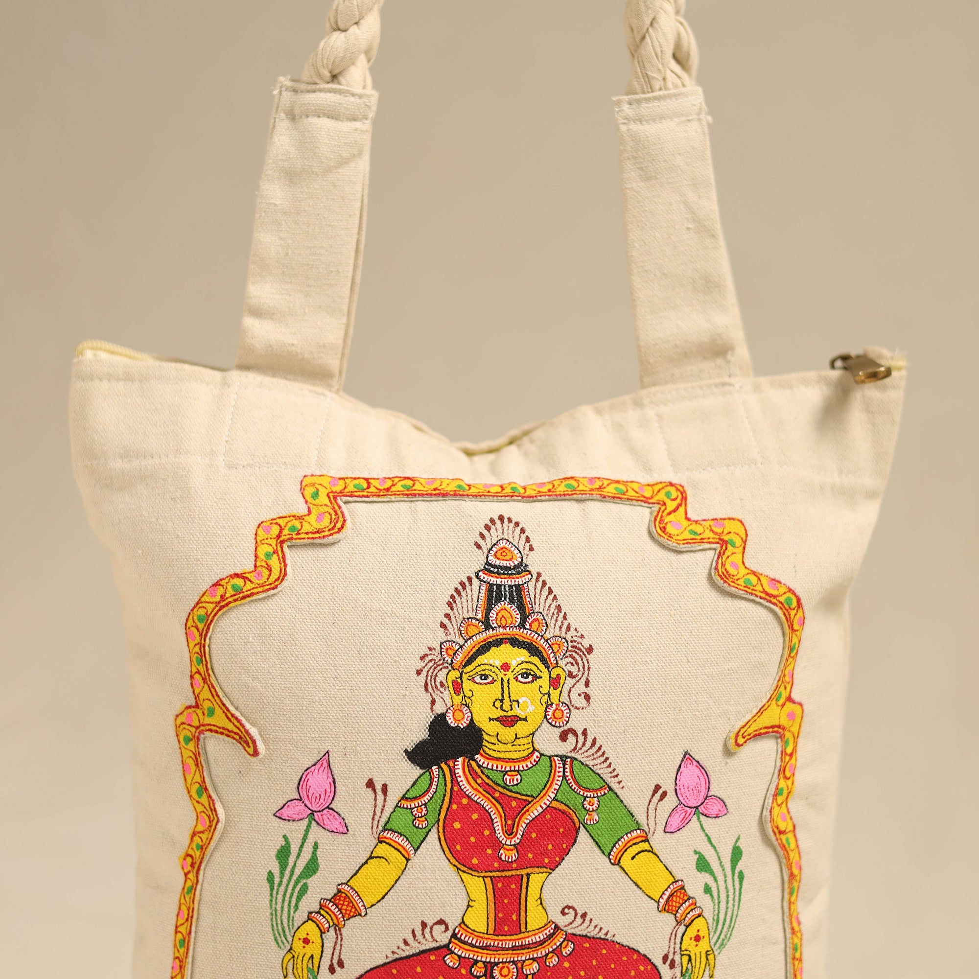 Step out in style with this beige pattachitra handpainted shoulder bag from Odisha. Crafted from canvas cotton adorned with intricate handpainted designs. It features a inside two pockets and spacious compartment for all your essentials.