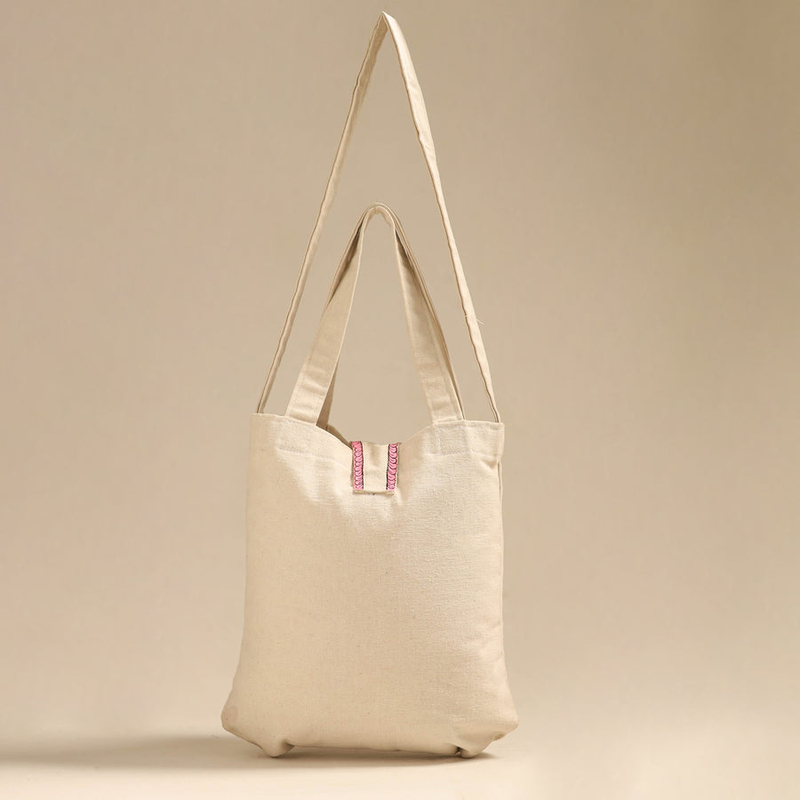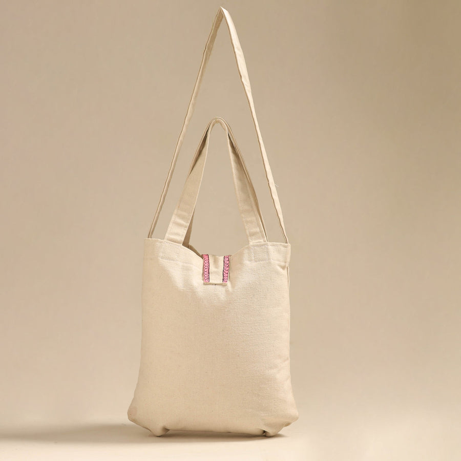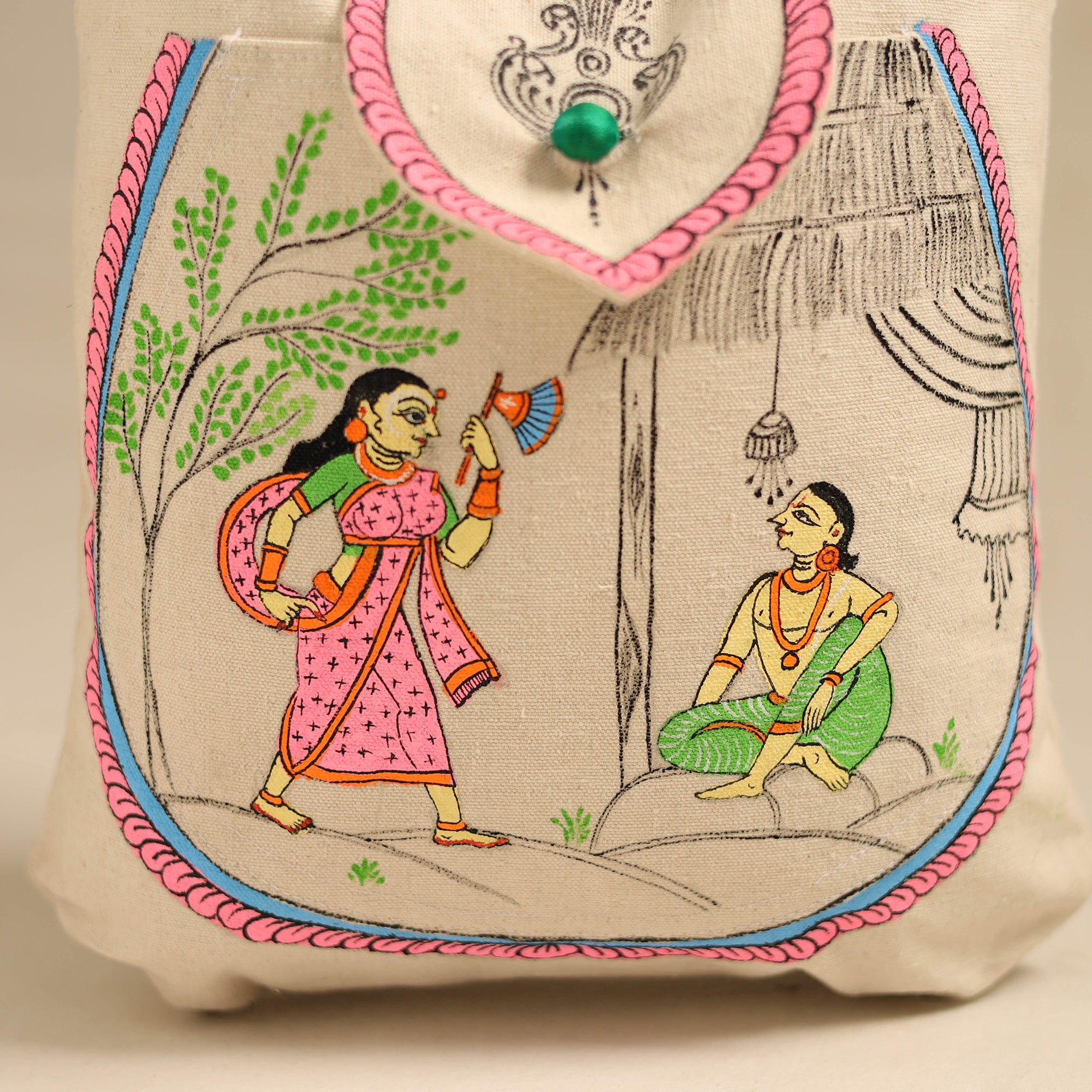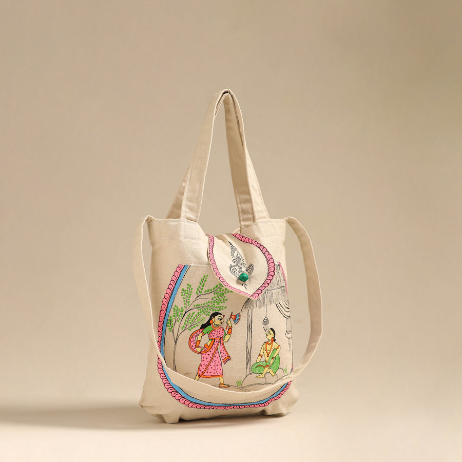 Step out in style with this beige pattachitra handpainted shoulder bag from Odisha. Crafted from canvas cotton adorned with intricate handpainted designs. It features a front pocket, inside zippered pocket and spacious compartments for all your essentials.