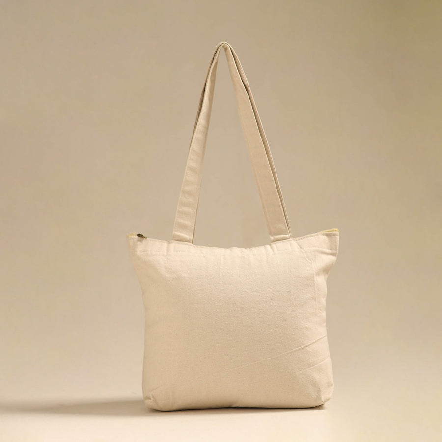 Step out in style with this beige pattachitra handpainted shoulder bag from Odisha. Crafted from canvas cotton adorned with intricate handpainted designs. It features a spacious compartment, two inner pockets, a secure zipper pocket.