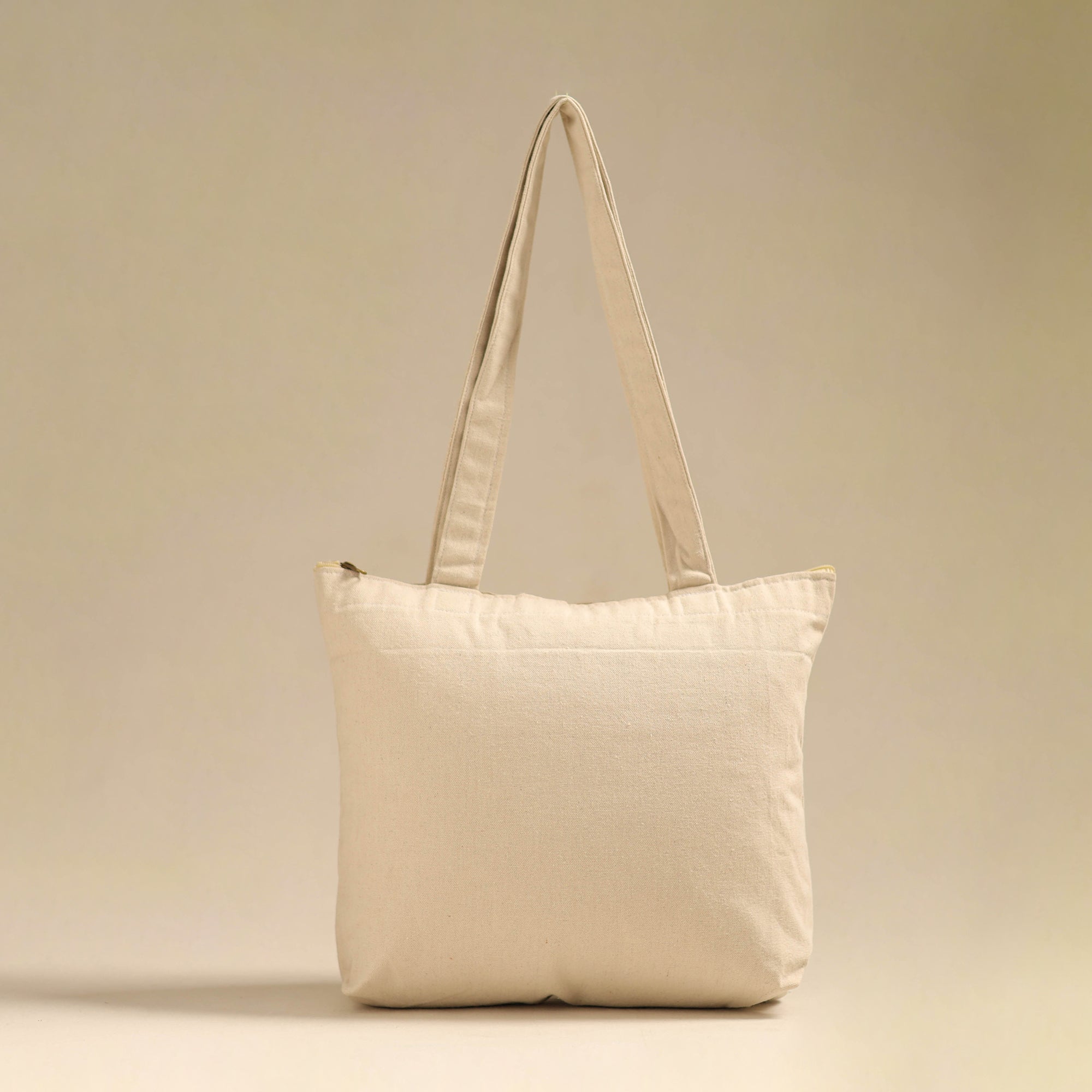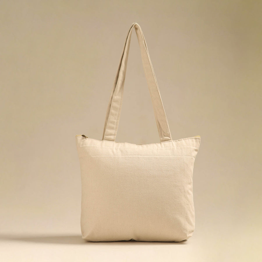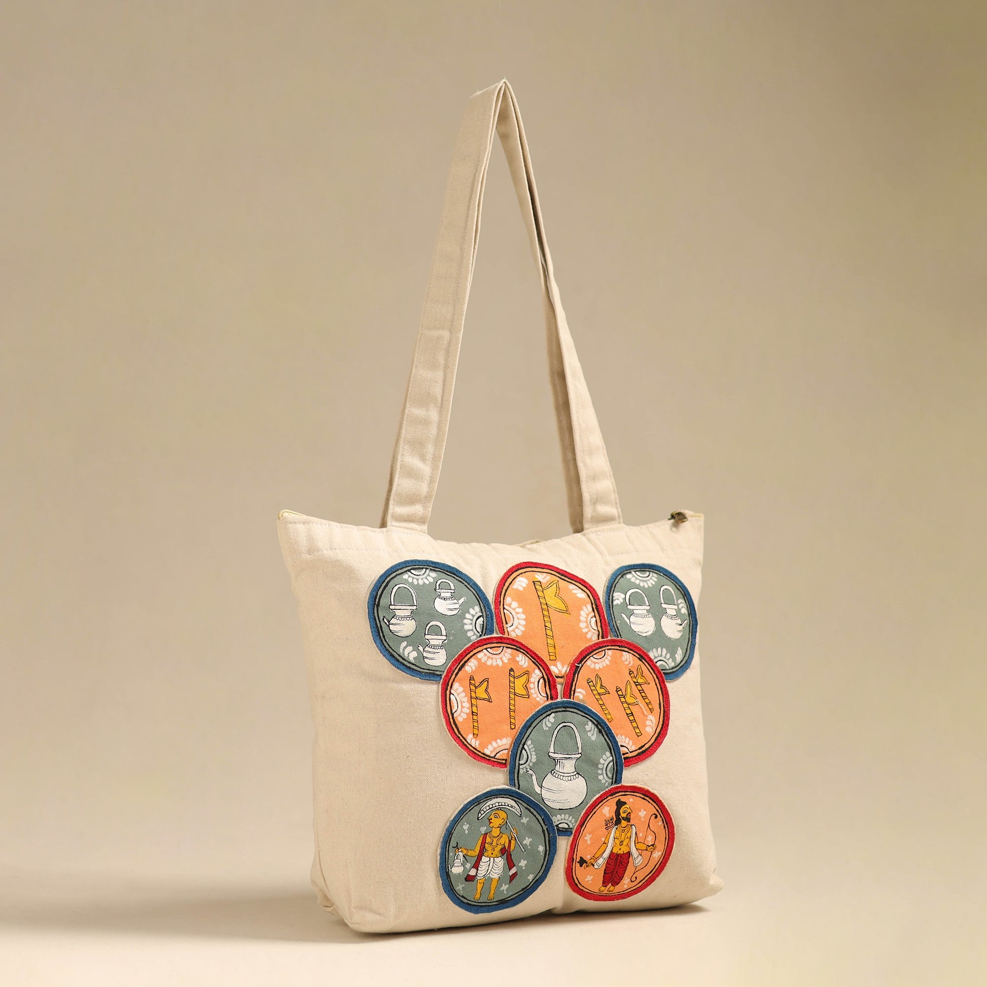 Step out in style with this beige pattachitra handpainted shoulder bag from Odisha. Crafted from canvas cotton adorned with intricate handpainted designs. It features a spacious compartment, two inner pockets, a secure zipper pocket.
