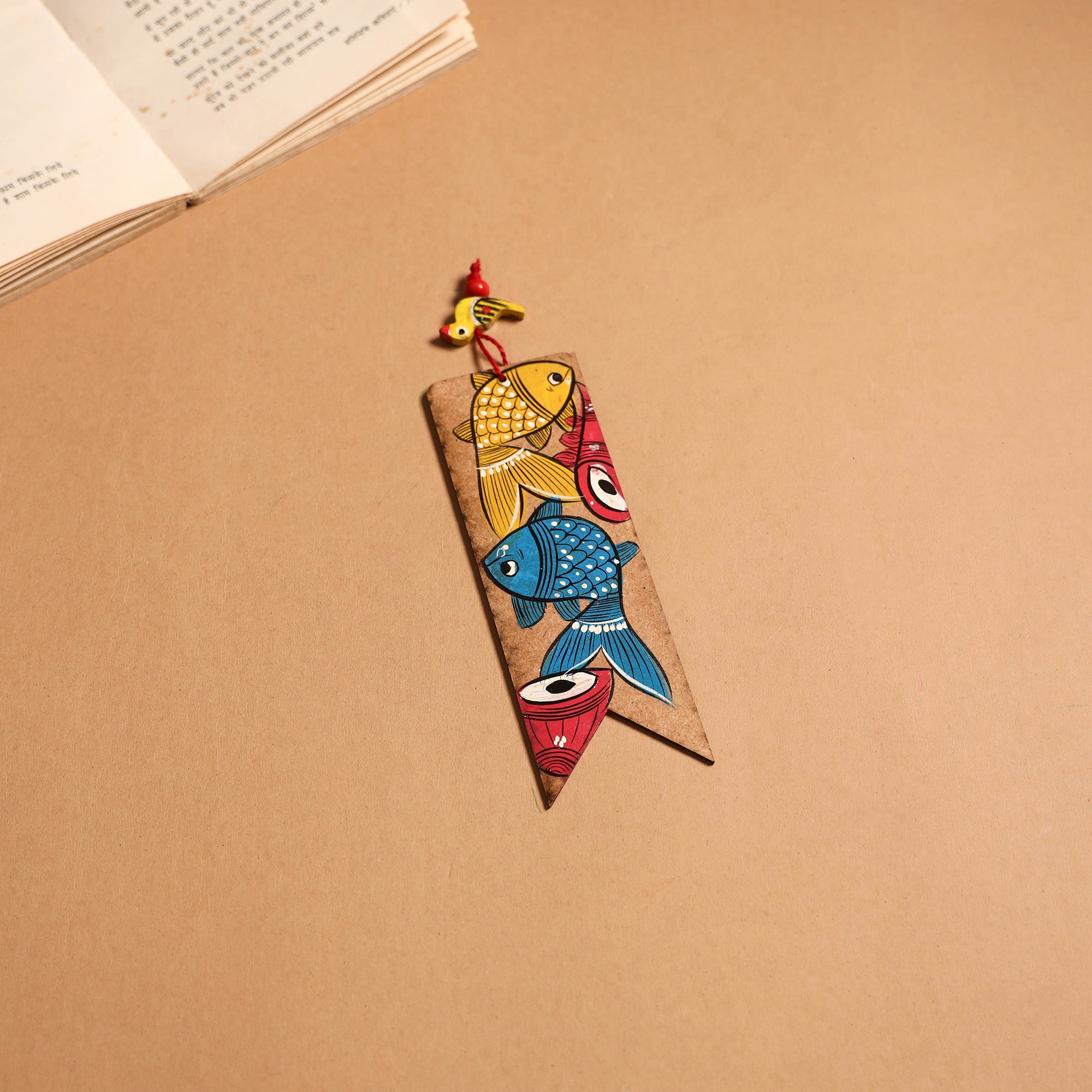 Handpainted bookmark crafted on fiberboard using acrylic colours. It showcases vibrant Patua art from West Bengal, known for its bold patterns, storytelling style, and nature-inspired motifs. This bookmark adds a touch of tradition to your reading and makes a meaningful keepsake for book lovers and art enthusiasts.