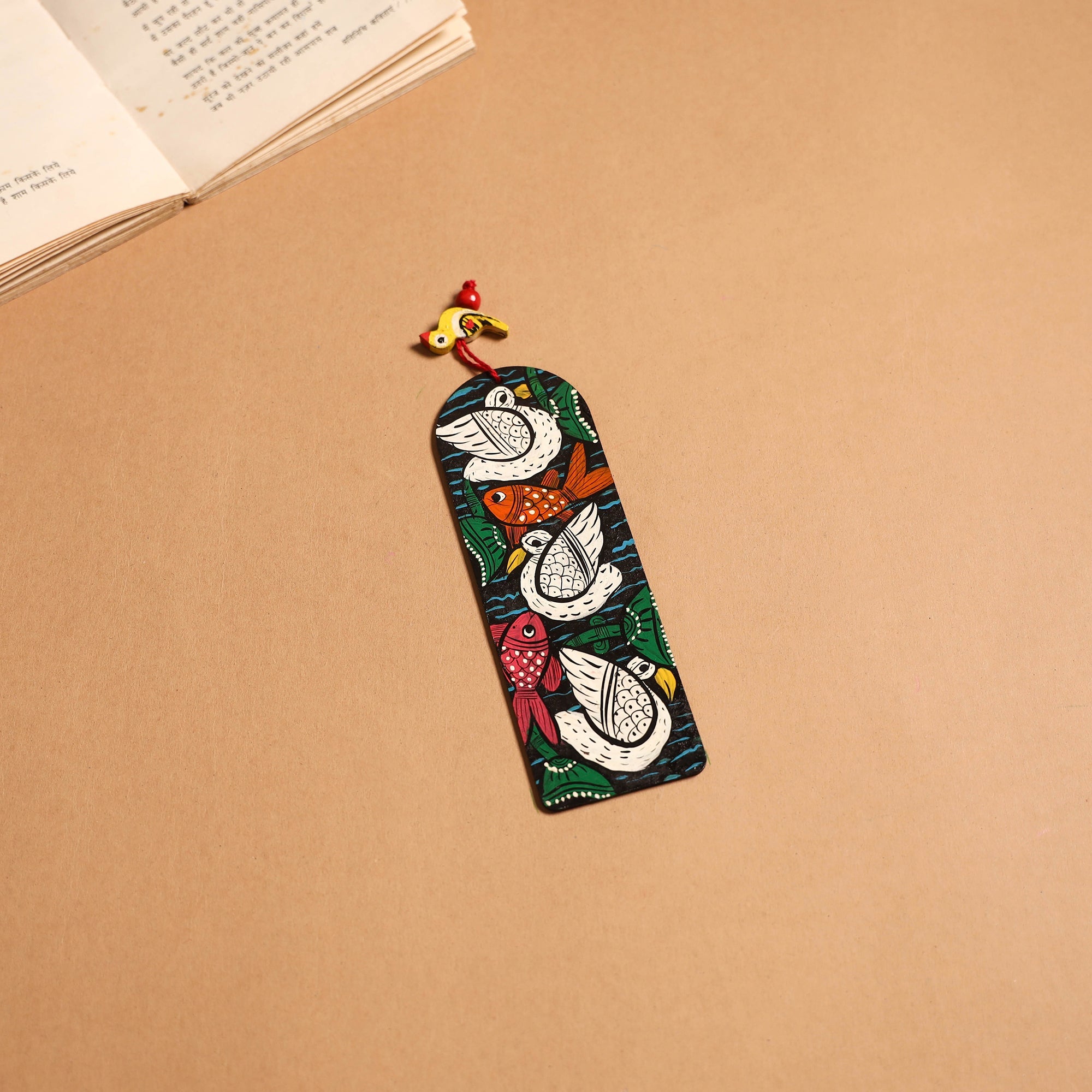 Handpainted bookmark crafted on fiberboard using acrylic colours. It showcases vibrant Patua art from West Bengal, known for its bold patterns, storytelling style, and nature-inspired motifs. This bookmark adds a touch of tradition to your reading and makes a meaningful keepsake for book lovers and art enthusiasts.