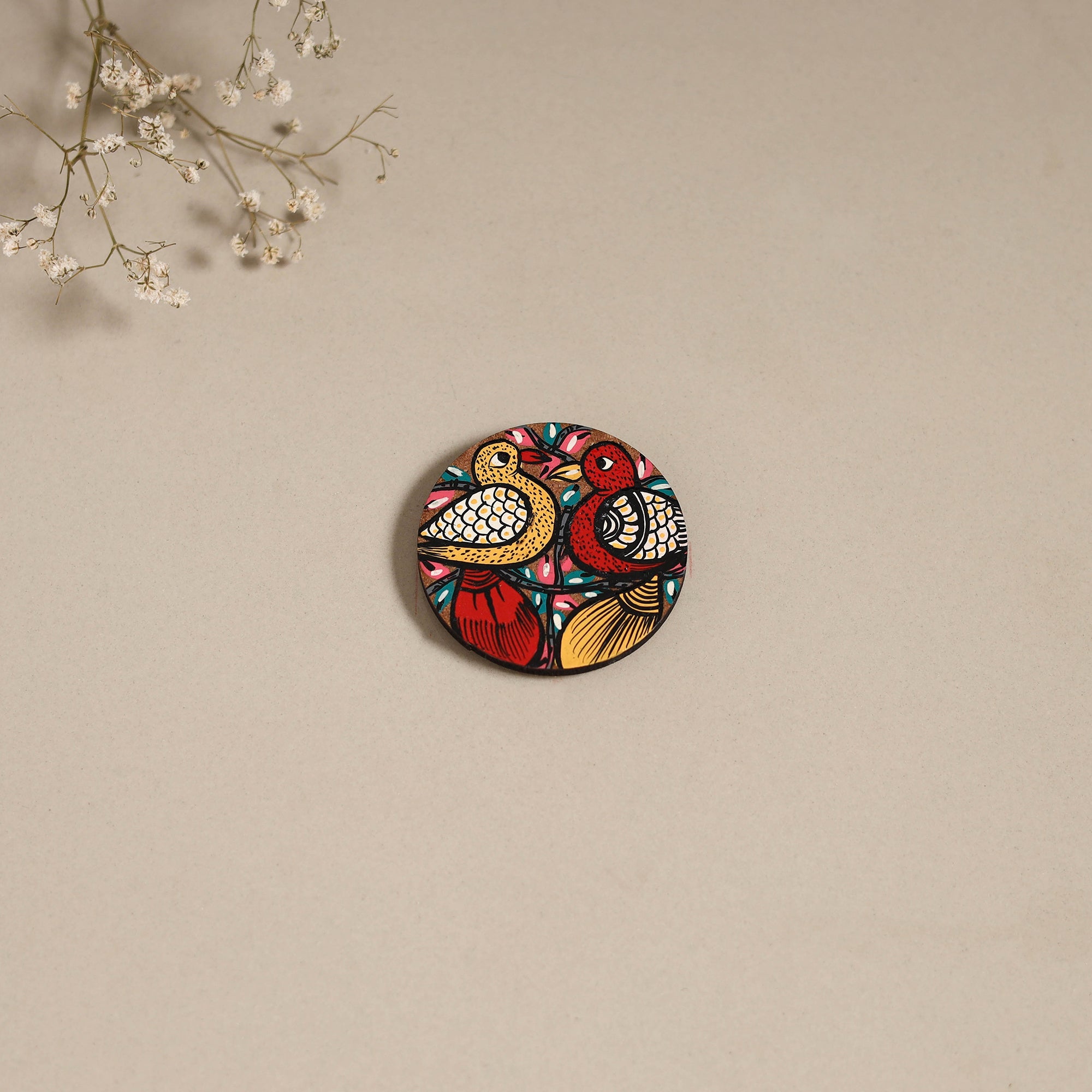 Bring home the charm of patua tradition with this hand-painted magnet. Made on durable fiberboard and enriched with vivid acrylic shades, it highlights the fine detailing of this folk artistry. A delightful accent for your fridge, wardrobe, or any magnetic corner of your home.