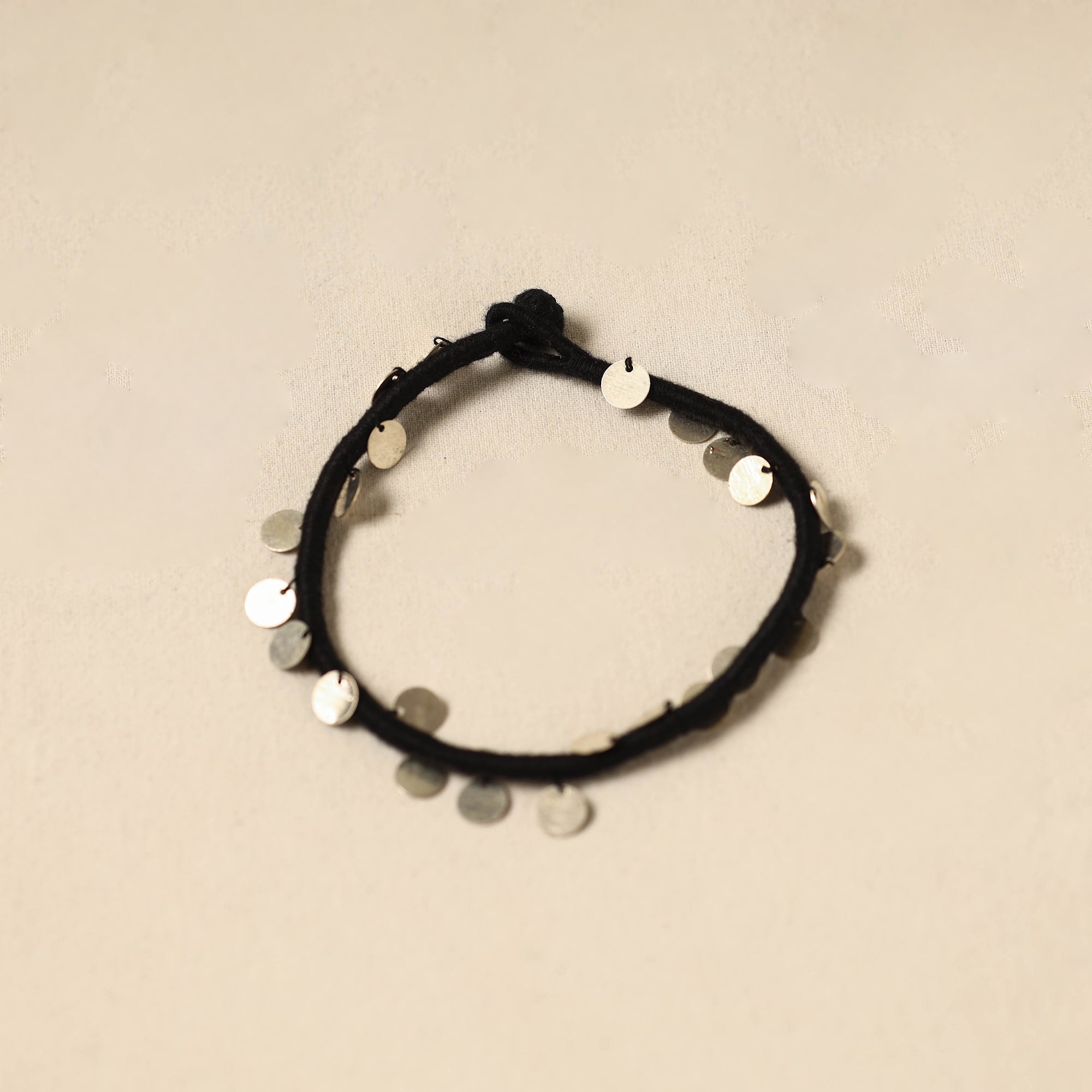 Black patwa anklet made from thick weaves of thread with copper base oxidised metal beads (german silver polished) handcrafted by the master craftsmen Kailash Patwa. Patwa is a traditional thread craft that originated in Rajasthan, practiced primarily by the Patwa community and continues to thrive in parts of the state.