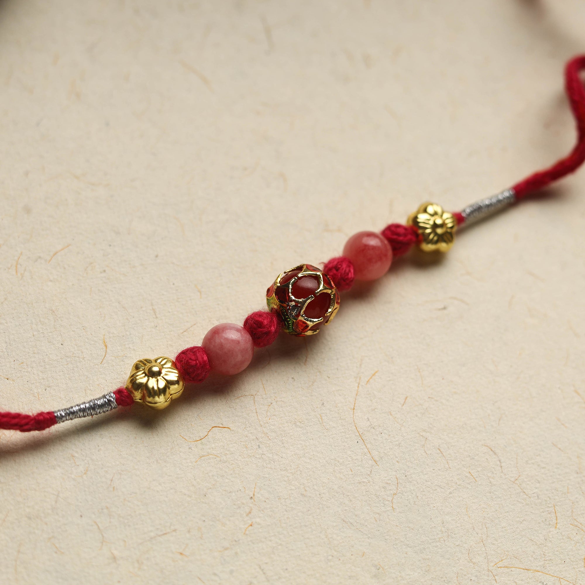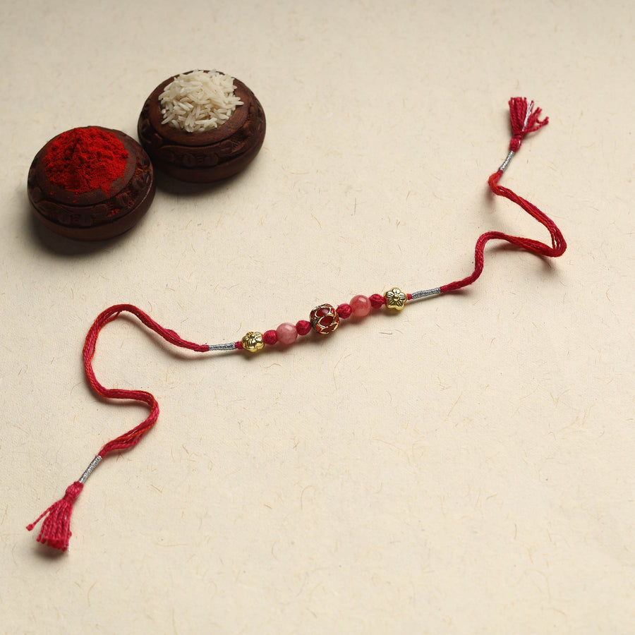 Celebrate the bond of sibling love with this handmade patwa rakhi, crafted using intricate thread and beadwork. This rakhi is made by artisans using the traditional patwa technique, a special thread craft that originated in Rajasthan and is now practiced across various regions of the state. The word 'Patwa' comes from the hindi word ‘pat,’ meaning cotton and silk thread. A beautiful way to cherish your connection this Raksha Bandhan.