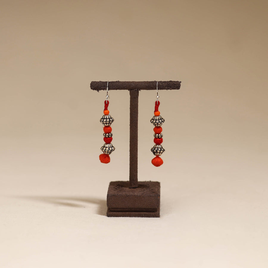 Orange patwa earrings made from thick weaves of thread with copper base oxidised metal beads (german silver polished) handcrafted by the master craftsmen Kailash Patwa. Patwa is a traditional thread craft that originated in Rajasthan, practiced primarily by the Patwa community and continues to thrive in parts of the state.