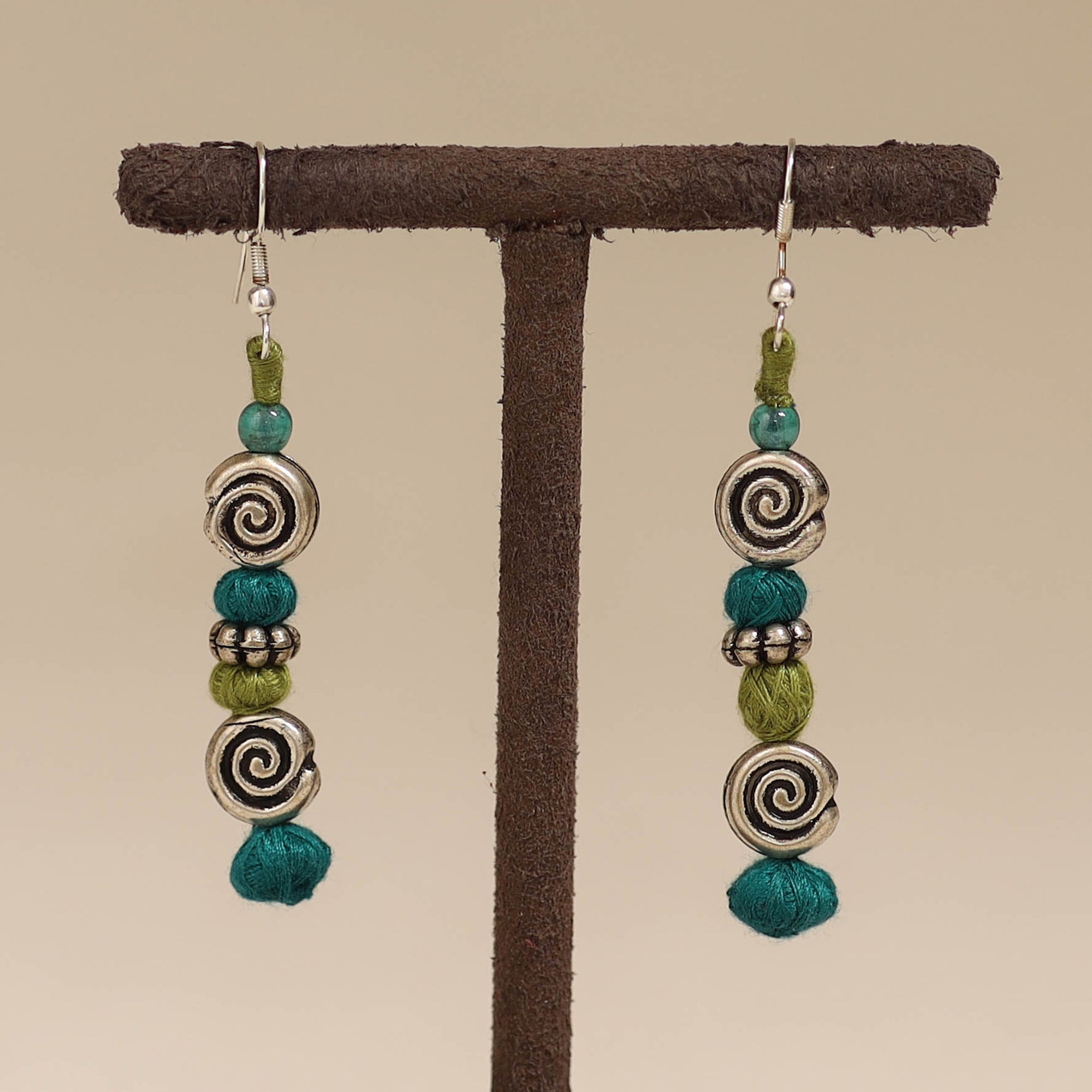 Green patwa earrings made from thick weaves of thread with copper base oxidised metal beads (german silver polished) handcrafted by the master craftsmen Kailash Patwa. Patwa is a traditional thread craft that originated in Rajasthan, practiced primarily by the Patwa community and continues to thrive in parts of the state.