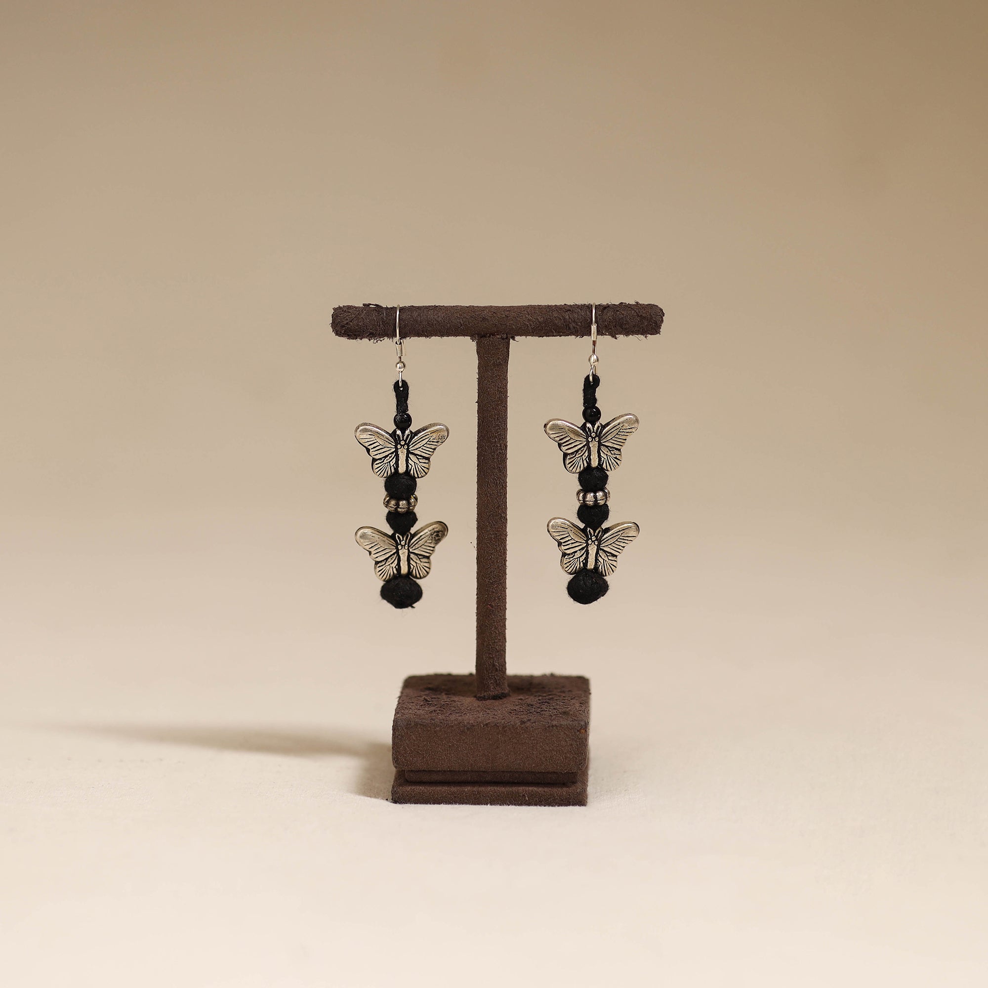Black patwa earrings made from thick weaves of thread with copper base oxidised metal beads (german silver polished) handcrafted by the master craftsmen Kailash Patwa. Patwa is a traditional thread craft that originated in Rajasthan, practiced primarily by the Patwa community and continues to thrive in parts of the state.